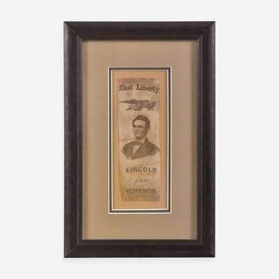 1864. Silk presidential campaign ribbon, with bust portrait of a beardless Abraham Lincoln at center, and printed text, "East Liberty Lincoln and Johnson; 6 1/4 x 2 1/8 in. (159 x 54 mm) (sight). Silk darkened; fraying at top and bottom edges, slightly affecting some letters; soiling in bottom half. In mat and in frame, 12 x 7 5/8 in. (305 x 194 mm).