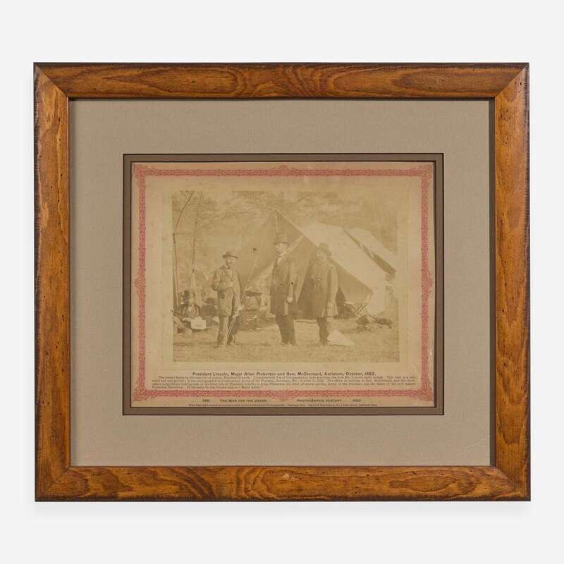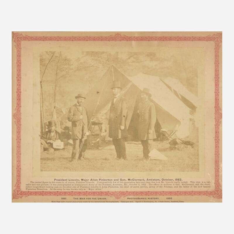 Hartford, Conn(ecticut).: Taylor & Huntington, ca. 1880s-90s. Albumen photograph mounted to card. From the series, The War for the Union. Photographic History 1861-1865; printed red ornamental border, with printed text below image, "President Lincoln, Major Allen Pinkerton and Gen. McClernard, Antietam, October, 1862." Scattered surface wear and spotting; verso with printed text listing other photographs from the series for sale. Albumen: 6 1/2 x 8 1/2 in. (165 x 216 mm), card: 8 1/2 x 10 5/8 in. (216 x 270 mm). In mat and in frame, 15 x 17 1/8 in. (381 x 435 mm).