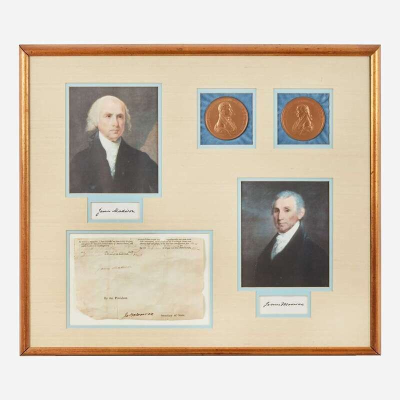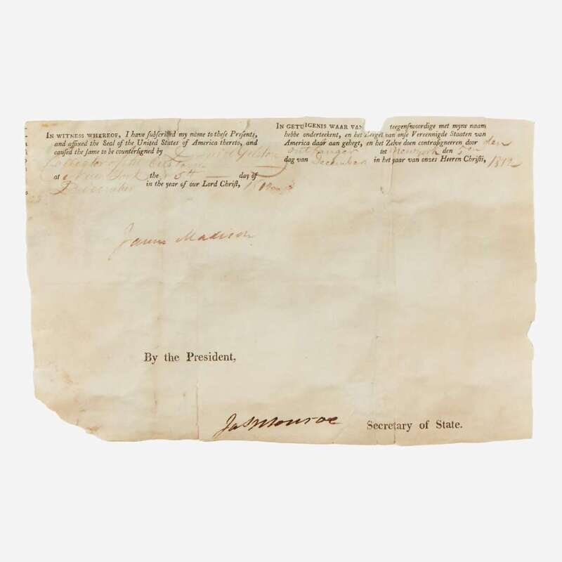 (Washington, D.C.), December 5, 1812. One sheet, approximately 5 5/8 x 8 3/4 in. (143 x 222 mm) (sight). Fragment of a partially-printed ship's passport, signed by James Madison as President; counter-signed by James Monroe, as Secretary of State. Creasing from original folds; chipping and small closed tears along edges. Handsomely framed with portraits of Madison and Monroe, as well as two presidential medallions, 21 1/2 x 25 in. (546 x 635 mm).