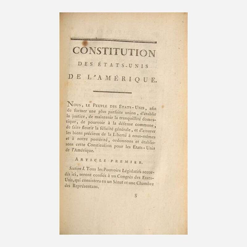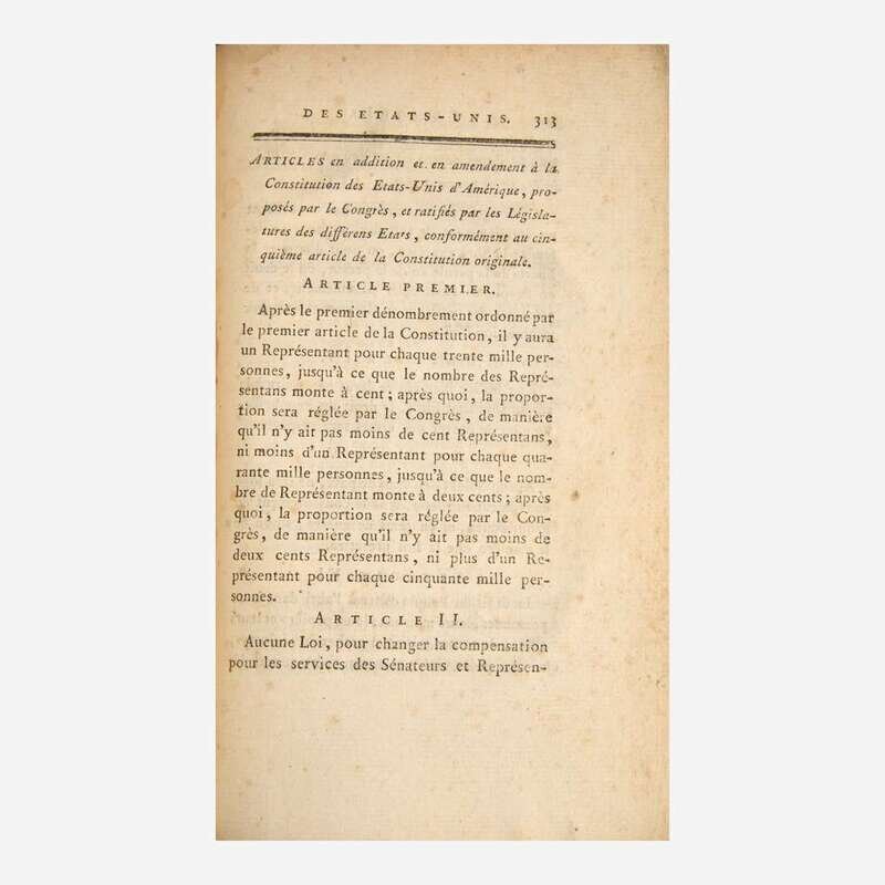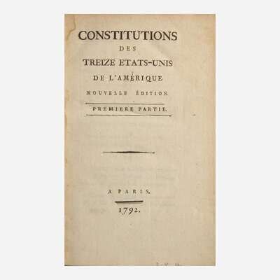 First published by the Duc de le Rochefoucault in 1783 at the suggestion of Benjamin Franklin, this second edition, published nine years later, reprints Rochefoucault's translation of the constitutions of the 13 United States, as well as other important documents from the founding of the US, including the Declaration of Independence, the Articles of Confederation, as well as various treaties and alliances. This second edition, published at the height of the French Revolution, was updated to print the newly enacted Constitution and Bill of Rights, and was likely very influential in French debates after the fall of the monarchy leading up to their second Constitution of 1793.