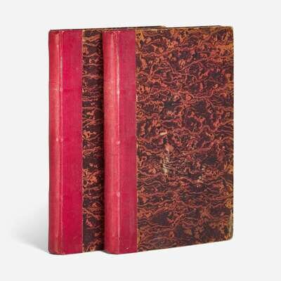 Paris, 1792. In two volumes. Nouvelle Edition (Second edition). 8vo. (ii), 323, (1); 317 pp. Translated into French by the Duc de la Rochefoucault. Quarter red cloth over marbled paper-covered boards, stamped in gilt, extremities and boards rubbed; speckled edges; dampstaining in fore-edge of most leaves of first volume, moderate to heavy foxing and offsetting in same; scattered foxing in second volume. Howes C-716; Sabin 16120