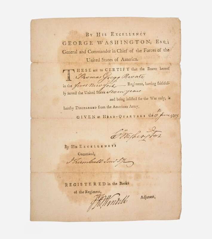 (Newburgh, New York), June 12, 1783. One sheet, 11 x 8 1/4 in. (279 x 209 mm). Partially-printed military discharge, accomplished in a secretarial hand, and signed by George Washington as Commander of the Continental Army, for "Thomas Gregg Private in the first New York--Regiment, having faithfully served in the United States seven years and being inlisted for the War only, is hereby Discharged from the American Army."; counter-signed by aide-de-camp J(onathan) Trumbull, Jr., and the recording adjutant; docketed on verso. Creasing from contemporary folds; edges lights worn; large sections of browning, but not affecting Washington's signature.