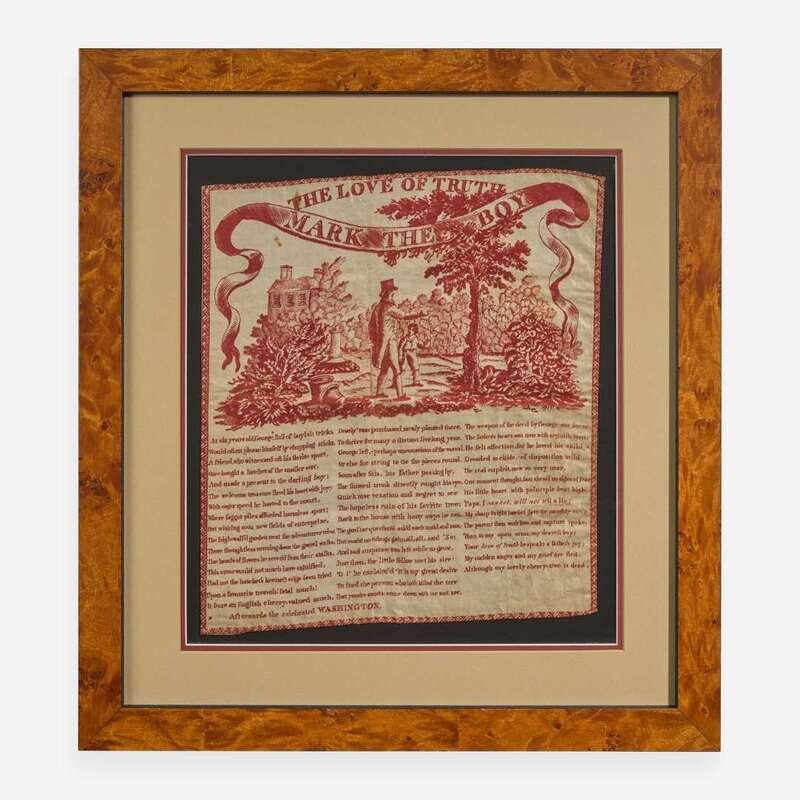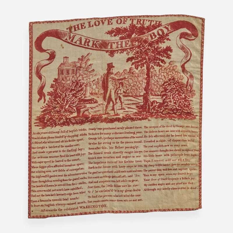 A rare variant of this handkerchief depicting the popular story of George Washington and the cherry tree. The enduring legend was invented by early Washington biographer Mason Locke Weems, and first appeared in the fifth edition of his Life of Washington, in 1806. This handkerchief is possibly the first appearance of the famed story in verse, as its printing has been attributed to the same year as Weems's fifth edition.