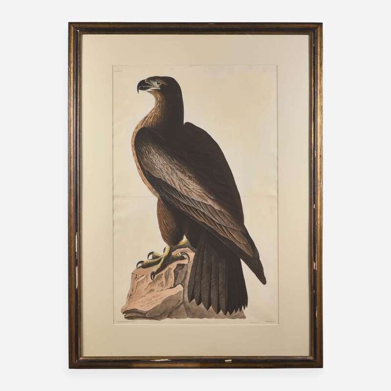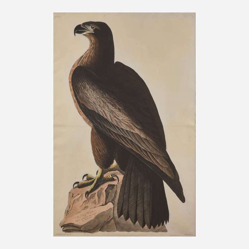 Plate 11 from Audubon's The Birds of America (London, 1827-38). "Painting and plate depict one bird standing on a rock, with no other background. In the painting, there is extensive writing on the rock, including: 'Sea Eagle Falco Ossifragus.' 'New Orleans, 1822' is also written on the painting. From his early writings it is clear that Audubon knew that immature Bald Eagles lack white feathers, yet he insisted that this bird XI was a new species, which he named the Bird of Washington, even though it is plainly an immature Bald Eagle..." (Susanne M. Low, A Guide to Audubon's Birds of America, pp. 35).