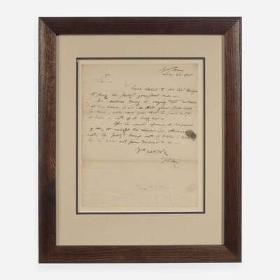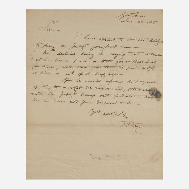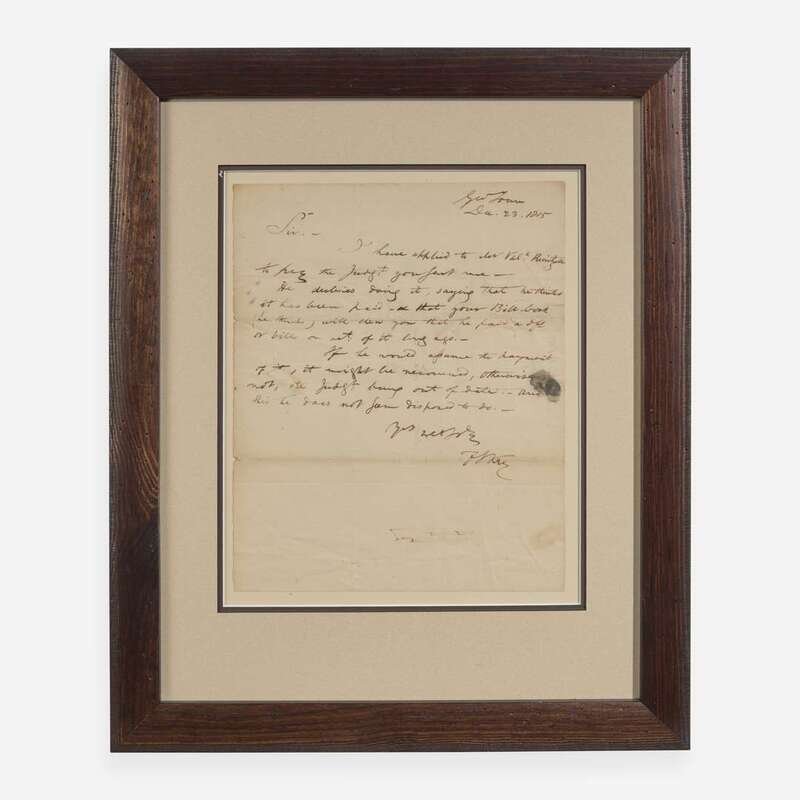 Geo(rge) Town, (Washington, D.C.), Dec(ember). 23, 1815. One sheet, 10 1/8 x 8 1/4 in. (257 x 209 mm). Autograph letter, signed by Francis Scott Key, to Baltimore merchant William Taylor regarding a business matter: "Sir.-- / I have applied to Mr. Vale: R____ / to pay the Judg't you sent me -- / He declines doing it, saying that he thinks / it has been paid--& that your Bill-book / (he thinks) will shew you that he paid a d(ra)ft / or bill on ac(coun)t of it long ago.-- / If he would assume the payment / of it, it might be recovered, otherwise / not, the Judg(emen)t being out of date.-- And / this he does not seem disposed to do.-- / Y(ou)rs resp(ectfully) / FS Key"; addressed on verso by Key, postal ink stamp and docketing to same. Creasing from original folds; loss on left edge from wax seal when opened; separation along top vertical fold. In mat and in frame, 17 3/8 x 14 5/16 in. (441 x 363 mm).