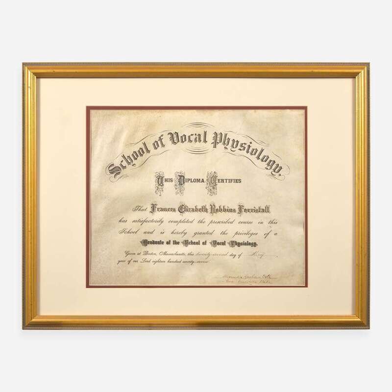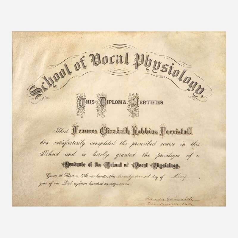 Boston, May 22, 1877. Single vellum sheet, 13 x 16 in. (330 x 406 mm) (sight). Partially-printed School of Vocal Physiology diploma, signed by Alexander Graham Bell, for Frances Elizabeth Robbin Forristall; also signed by Bell's father, Alex: Melville Bell. In mat and in frame, 19 7/8 x 25 3/4 in. (504 x 654 mm).