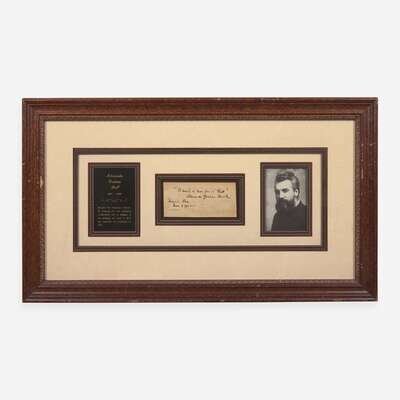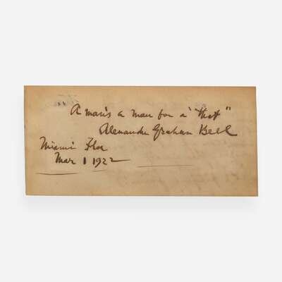 Miami, Fl(ordi)a, Mar(ch) 1, 1922. Single sheet, 2 1/2 x 5 in. (63 x 127 mm) (sight). Autograph quote, signed by Bell, being the title of Robert Burns's 1795 poem: "'A man's a man for a' that' / Alexander Graham Bell". In mat with a portrait of Bell, 13 1/2 x 23 1/2 in. (343 x 597 mm).