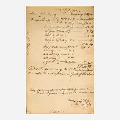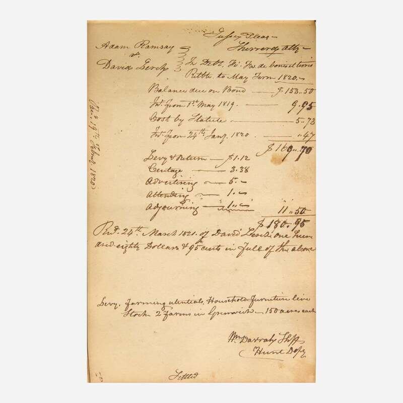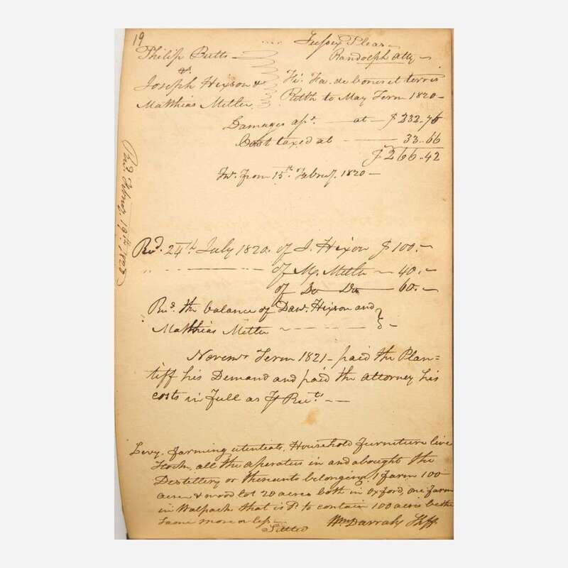 A fascinating manuscript journal from Sussex County Sheriff William Darrah (1777-1830), recording his notes from 75 court cases, and listing dozens of plaintiffs and defendants, the presiding judges and attorneys, as well as enumerating the numerous court costs, and resulting damages awarded. Darrah served as Sussex County's 23rd Sheriff from 1818-21.