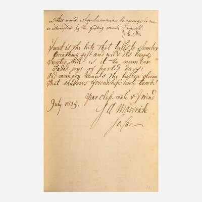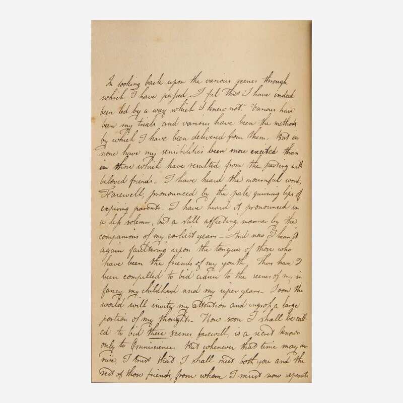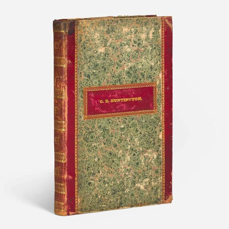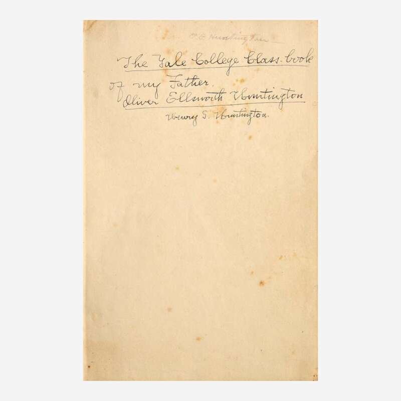 (New Haven, Connecticut), 1824-27. 8vo. Class of 1825 graduate Oliver Ellsworth Huntington's yearbook, comprising approximately 98 autograph inscriptions, notes, and quotes, largely from Huntington's 1825 graduating classmates, as well as additional entries from members of the classes of 1824 and 1826. Original three-qaurter red morocco over marbled paper-covered boards, red morocco cover label, stamped in gilt, boards and extremities rubbed; all edges trimmed; inscribed by Huntington's son, Henry S. Huntington on front free endpaper, "The Yale College Class-book of my Father, Oliver Ellsworth Huntington"; scattered light foxing.
