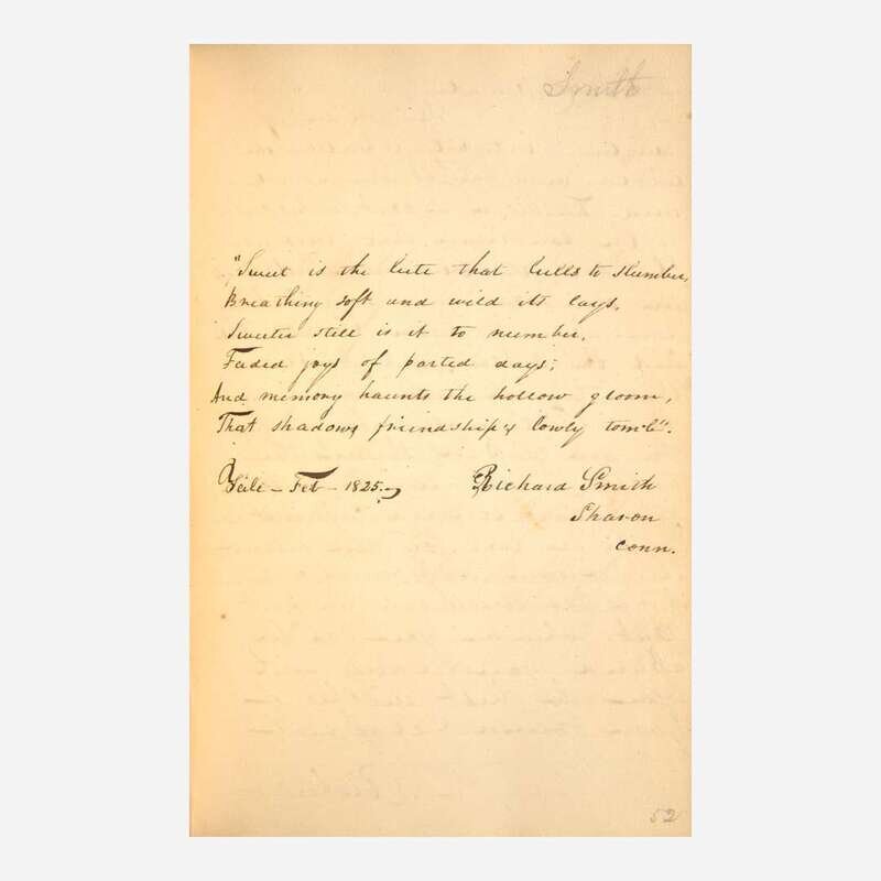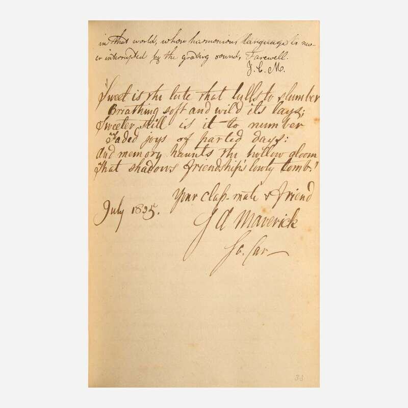 A scarce and early Yale University yearbook, inscribed by members of the graduating classes of 1824 and 1825, to fellow student and graduate of the class of 1825, Oliver Ellsworth Huntington (1802-77). Notable entries include Samuel Maverick (1803-70), fellow 1825 graduate and future legendary Texas lawyer and land baron, signer of the Texas Declaration of Independence, and source of the term "maverick."; Rev. George William Perkins, Presbyterian minister and abolitionist active in the Underground Railroad; Elizur Wright, abolitionist, mathematician, and the "father of life insurance"; Elias Warner Leavenworth, Mayor of Syracuse and Congressman from New York from 1875-77; Willis Hall, New York State Attorney General from 1839-42; Rev. Richard Falley Cleveland, father of 22nd and 24th president Grover Cleveland; Thomas Hinckley Bond, New York and Connecticut state politician; Rev. William Twining, abolitionist and founder of what would become Wabash College; Worthington Hooker, professor of medicine at Yale and vice-president of the American Medical Association; William Bennett Fleming, Georgia congressman in 1879; Seabury Ford, governor of Ohio from 1849-50; William Gelston Bates, Massachusetts state senator and congressman; and many more.