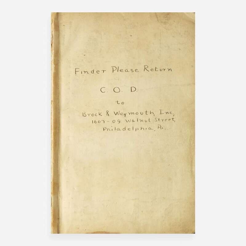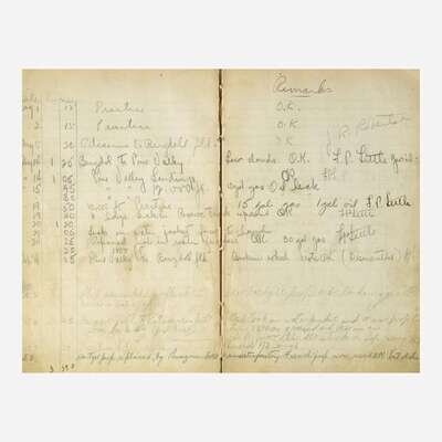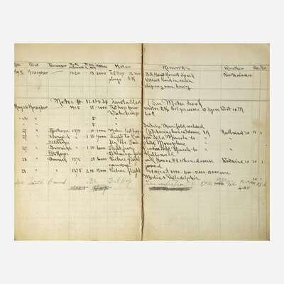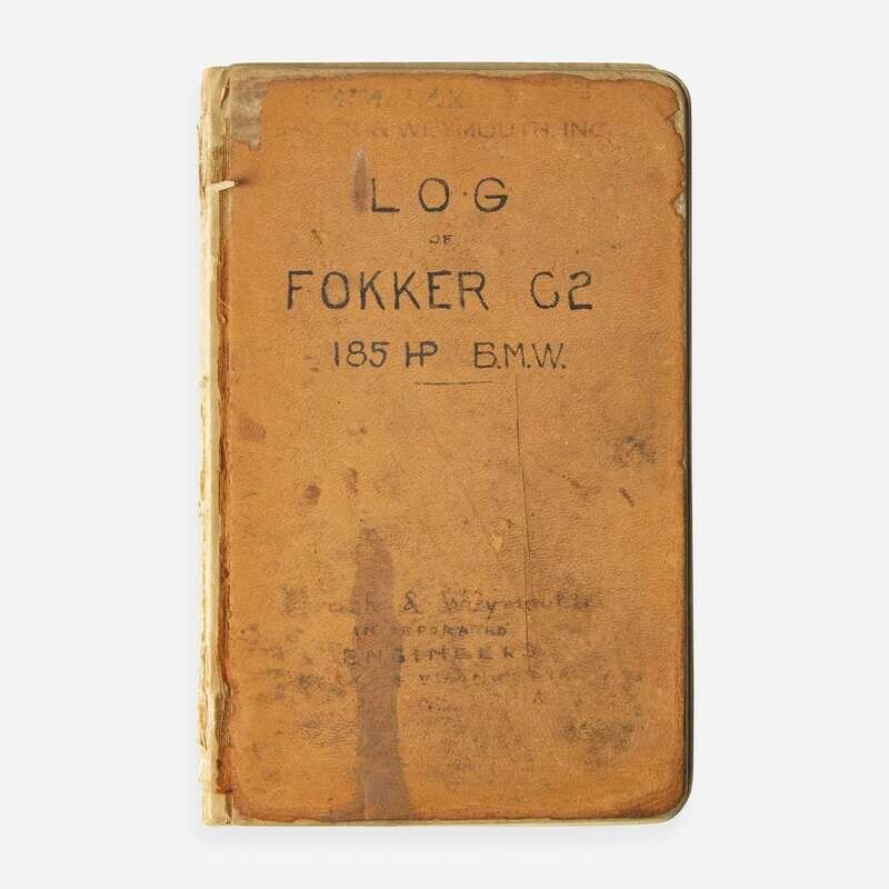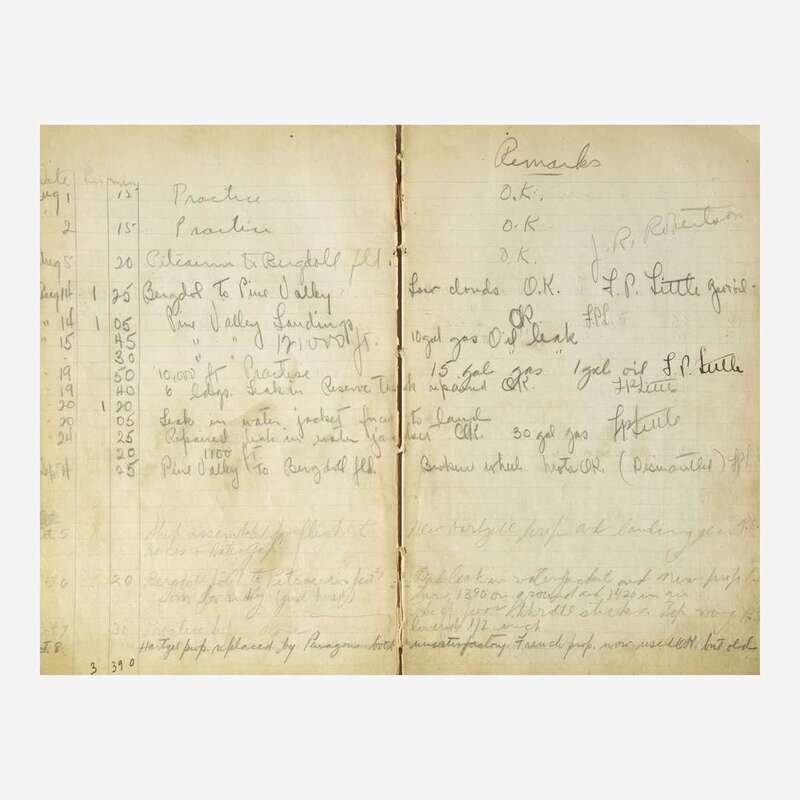 Locations vary, ca. November, 1923-August, 1927. 8vo. Manuscript flight log from the Philadelphia-based engineering company Brock & Weymouth, Inc.'s Fokker C2 aerial surveying aircraft. Executed in the hand of multiple pilots on 43, largely consecutive, pages; many pages hand-ruled in ink or pencil in four to eight columns, listing the details of approximately 275 flights, including the date, length in hours and minutes, altitude, flight routes (Philadelphia, Bryn Athyn, West Virginia, Boston, New York, etc.), quantities of gas and oil, and remarks regarding weather conditions, aerial photography, and mechanical issues; some pages signed with pilot's name and/or initials, as well as accompanying passenger. Original full tan reverse calf-covered boards, manuscript on front board "Log of Fokker C2 185 HP B.M.W. Brock and Weymouth Engineers", faded Brock and Weymouth ink stamp at top of same, front and rear boards detached, spine perished, binding splitting, but holding; scattered minor soiling and smudging to text. From the library of aerial photography pioneer Virgil Kaufmann.