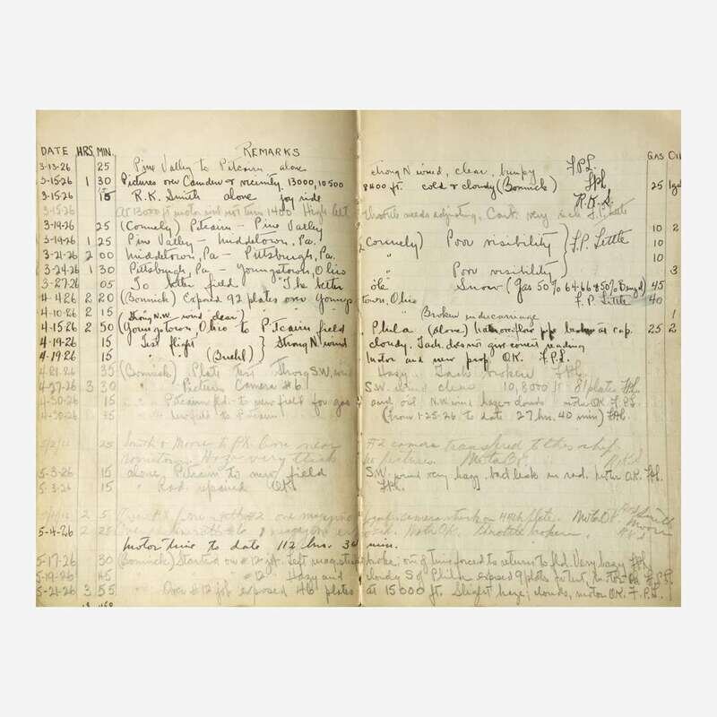 A fascinating and unique 1920s flight log from a pioneering aerial photography and surveying firm. Brock & Weymouth, Inc. were a Philadelphia-based engineering company active in the development of aerial mapping, surveying, and photography, and held patents on a process and equipment that produced highly accurate survey maps. They "made considerable progress in the 1920s toward understanding how to make precision maps from aerial photographs," and "had developed instruments with which high-resolution vertical aerial photographs could be translated--by a method involving steroptics--into contour maps of great detail and accuracy. Differences in elevation as small as half a meter could be plotted with the aid of some ground control." (The Mapmakers, John Noble Wilford, p. 273). This log covers over 200 flights made by the company's Fokker C2, a small lightweight two-seated Dutch-designed biplane, developed after the Fokker C1 reconnaissance aircraft. The log records numerous notes made by Brock & Weymouth pilots while testing photographic equipment onboard, while also evaluating mechanical issues of the plane and weather conditions. Although ahead of their time for their quality of the work, the Great Depression forced Brock & Weymouth to close. Their equipment, including their aerial cameras and contour mapping devices--and this log book--was bought by Virgil Kauffman (1898-1925), president of Aero Service Corporation--Brock & Weymouth's chief competitor.