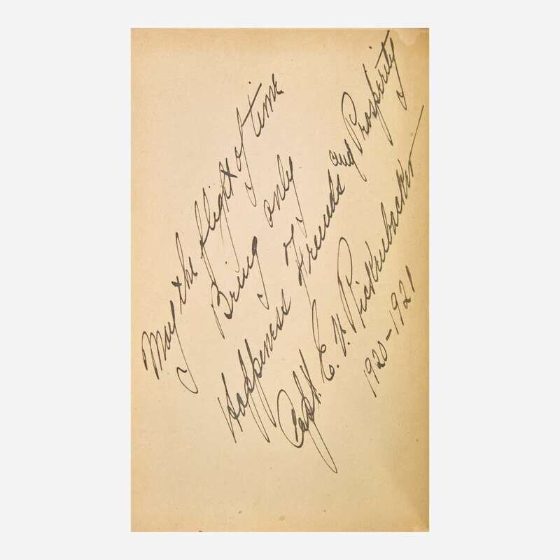 A handsome first edition of fighter pilot and Medal of Honor recipient Eddie Rickenbacker's World War I memoir. Inscribed by Rickenbacker presumably to the cofounder of General Motors, William "Billy" C. Durant (1861-1947), likely to commemorate their short-lived work together on the GM vehicle, the Sheridan. The Sheridan was GM's first car designed and manufactured from the ground up, and was marketed as a bridge between their various marques, Chevrolet, Buick, and Cadillac, etc. Production on the vehicle began in 1920, and in 1921 Rickenbacker was hired by GM to promote the vehicle. He became a vice president of the Sheridan Motor Car Company and its sales manager in California, during which time he likely worked with Durant's son, the racecar driver Russell Clifford Durant (1890-1937). At the time the younger Durant was vice president of sales in California for Chevrolet. Following the elder Durant's firing from GM toward the end of 1921 the Sheridan project was scrapped, and of the 800 cars produced, only two are known to survive.