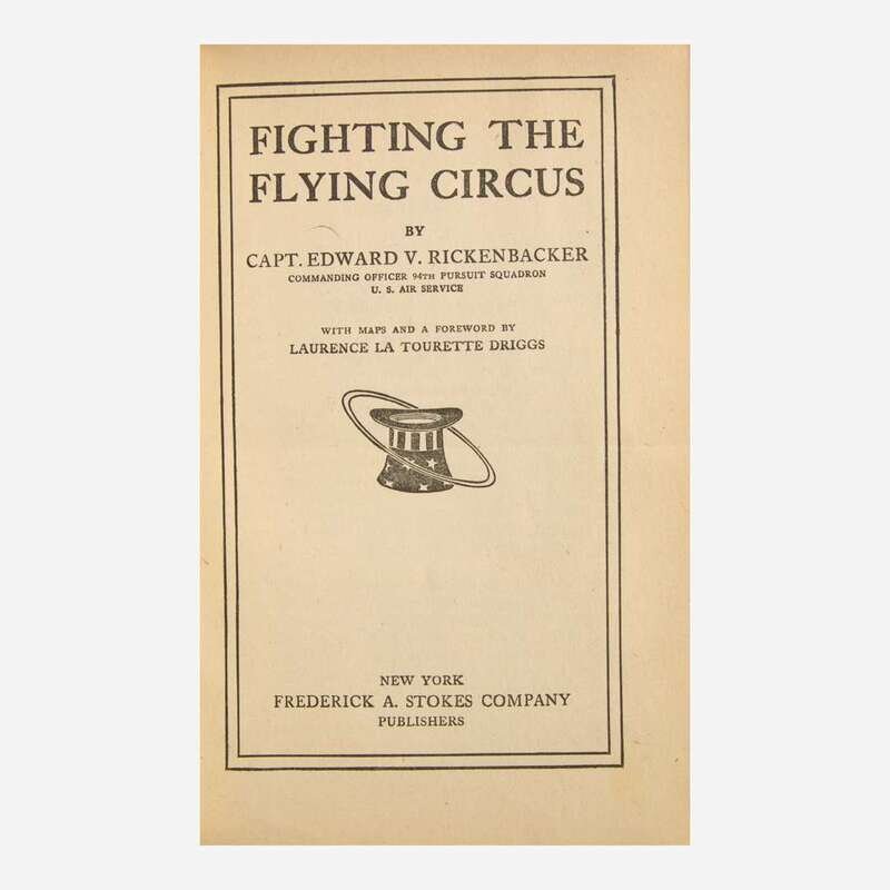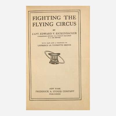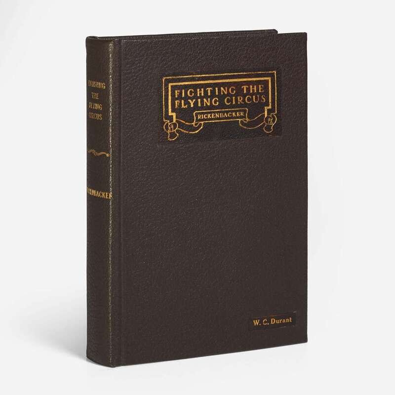 New York: Frederick A. Stokes Company, (1919). First edition. 8vo. viii, (4), 371 pp. Inscribed by Rickenbacker on verso of original front free endpaper, presumably to the founder of General Motors, William C. Durant, "May the flight of time / Bring only / Happiness Friends and Prosperity / Capt. E.V. Rickenbacker / 1920-1921". Illustrated with frontispiece portrait of Rickenbacker. Presumably rebound for Durant in full brown faux-leather, brown leather cover onlays, with Durant's name stamped in gilt at bottom of front board; top edge gilt, other edges trimmed; patterned endpapers; in slip case.