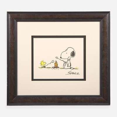 No place, no date. Original color illustration on paper signed by Charles Schulz, depicting his characters Snoopy and Woodstock. 9 x 10 3/4 in. (229 x 273 mm). In mat and in frame, 20 1/2 x 22 1/4 in. (520 x 565 mm).