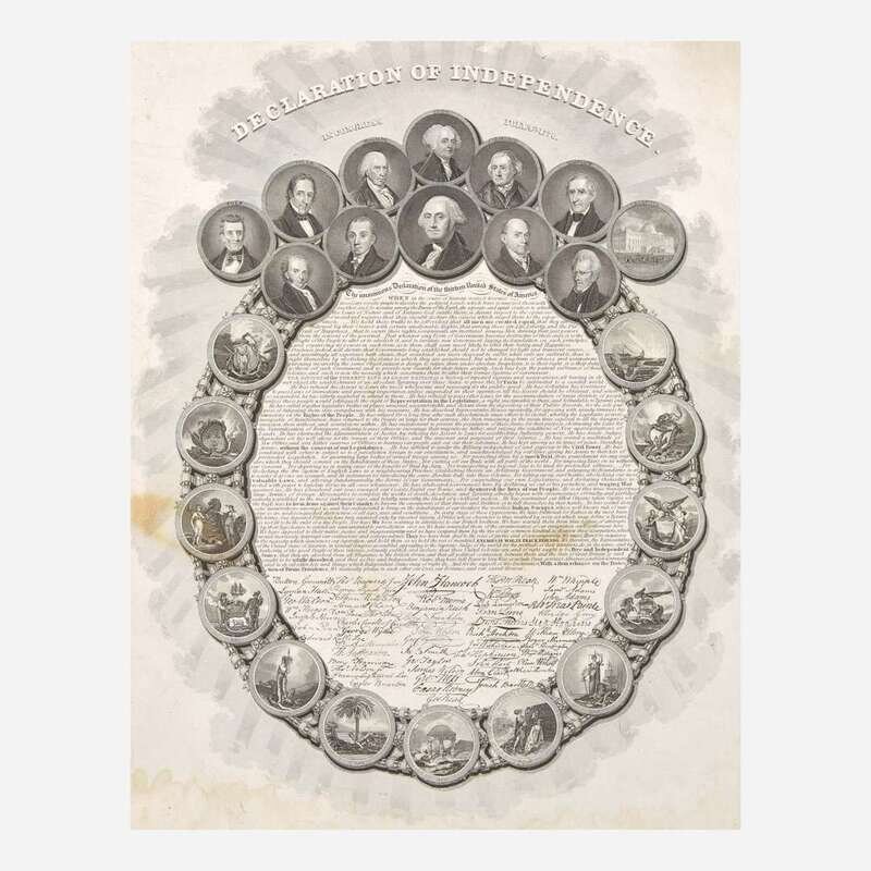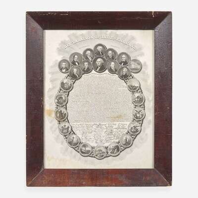 Second edition of George G. Smith's engraving of the Declaration of Independence. The Declaration is printed in small calligraphic font, and is surrounded by an elaborate border composed of the original 13 state seals as well as portraits of the first 11 presidents through to the newly elected James K. Polk. The first edition, printed ca. 1841-45, featured the presidents up to John Tyler and did not include the view of the Capitol building. A third edition was printed ca. 1849 that removed the Capitol image and replaced it with a portrait of 12th president Zachary Taylor.
