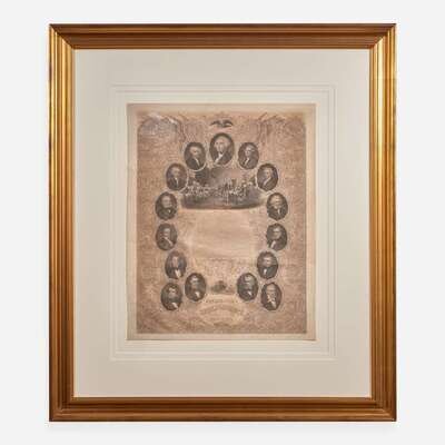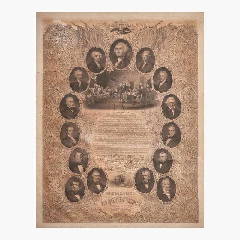 First edition of this elaborate engraving of the Declaration of Independence, with portraits of the presidents from George Washington to James Buchanan, vignette of the Washington family burial vault and a reproduction of John Trumbull's Declaration of Independence, surrounded in an ornate vine and floral border.