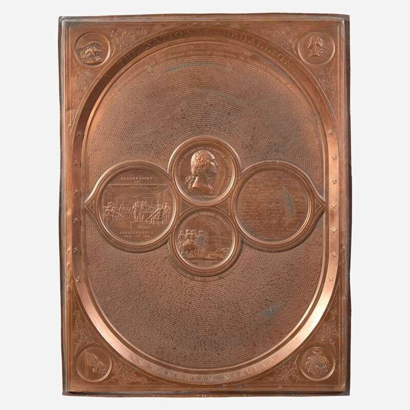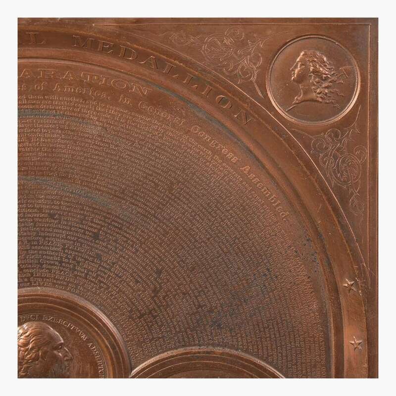 (New York: Samuel H. Black, ca. 1859). Large ornate and decorative copper plaque, printed in relief with the full text of the Declaration of Independence at top, a history at bottom titled, "Battle Role of the Revolution," with a summary of Presidents from George Washington to James Buchanan, and with four central medallions depicting John Trumbull's famous painting of the Declaration, the front and back of the "Washington Before Boston Medal," and facsimile signatures of all the Signers of the Declaration. Lightly worn, small patches of oxidation. 17 x 13 in. (432 x 330 mm).