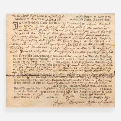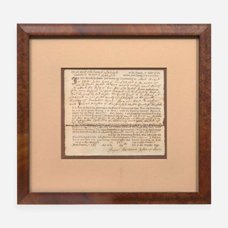 New Milford, September 22, 1755. Partially-printed document, completed and signed by Signer of the Declaration of Independence from Connecticut, Roger Sherman, as Justice of Peace, ordering the Sheriff of Litchfield to collect one hundred pounds from Eaton Jones; additionally signed by Sherman on verso. Creasing from old folds; very light foxing. In frame, 12 x 11 1/4 in. (305 x 285 mm).