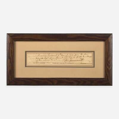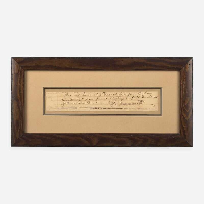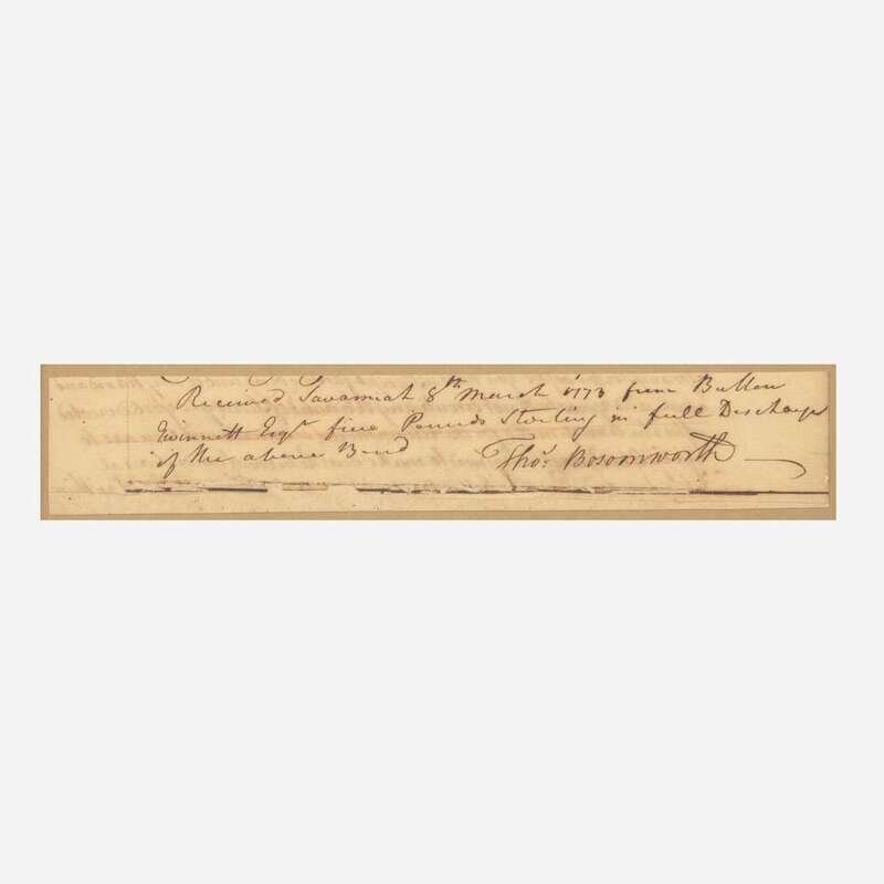 Savannah, March 8, 1773. Fragment of a manuscript document, signed by Thomas Bosomworth, authorizing receipt of payment from Signer of the Declaration of Independence from Georgia, Button Gwinnett, whose name appears in a secretarial hand: "Received Savannah 8th March 1773 from Button Gwinnett Esqr five Pounds Sterling in full Discharge of the above Bond." Written on the verso is a portion of the payment agreement. 2 x 10 in. (51 x 254 mm). Lightly toned, professional paper repairs along bottom. In mat and in frame, 8 1/2 x 16 1/2 in. (216 x 419 mm).