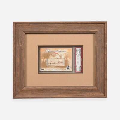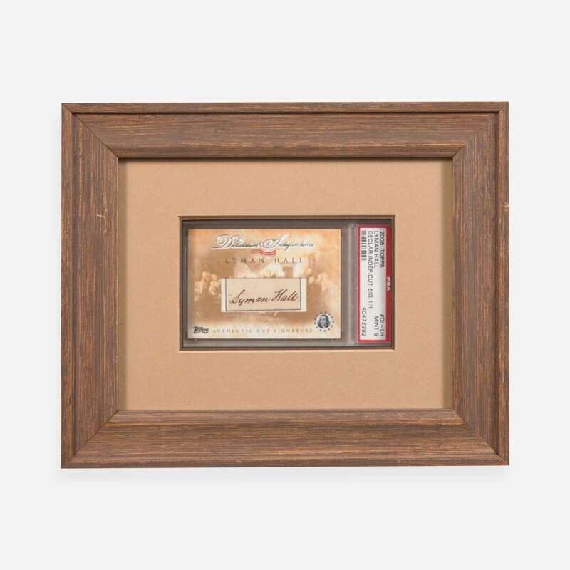 No place, no date. 3/4 x 1 3/4 in. (19 x 44 mm) (sight). Signature of Signer of the Declaration of Independence from Georgia, Lyman Hall (1724-1790), cut from another document. Mounted to a larger sheet; enclosed in a commemorative Topps card sleeve within PSA case, graded "Mint 9". Unexamined out of frame, 8 1/4 x 10 1/4 in. (209 x 260 mm).