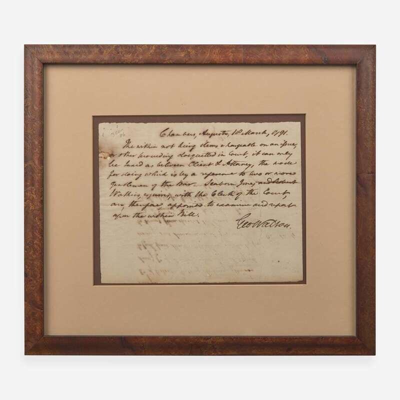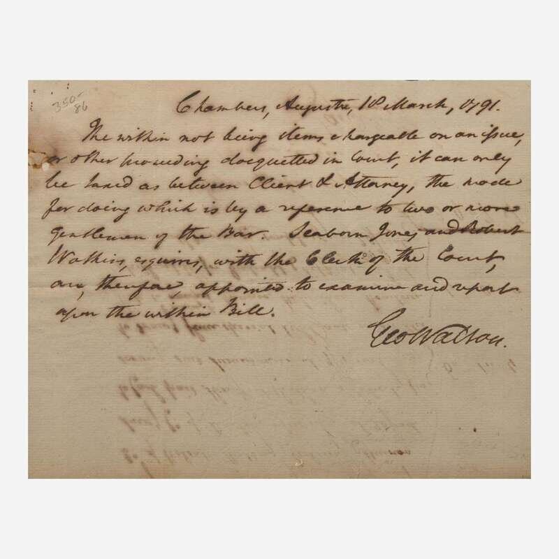 Augusta (Georgia), March 10, 1791. Single sheet, 6 x 7 3/4 in. (152 x 197 mm). Autograph document, signed by Signer of the Declaration of Independence from Georgia, George Walton (1749-1804), as a Judge of the Georgia Superior Court, settling a tax dispute. Stain, top left. In mat and in frame, 12 1/4 x 13 3/4 in. (311 x 349 mm).