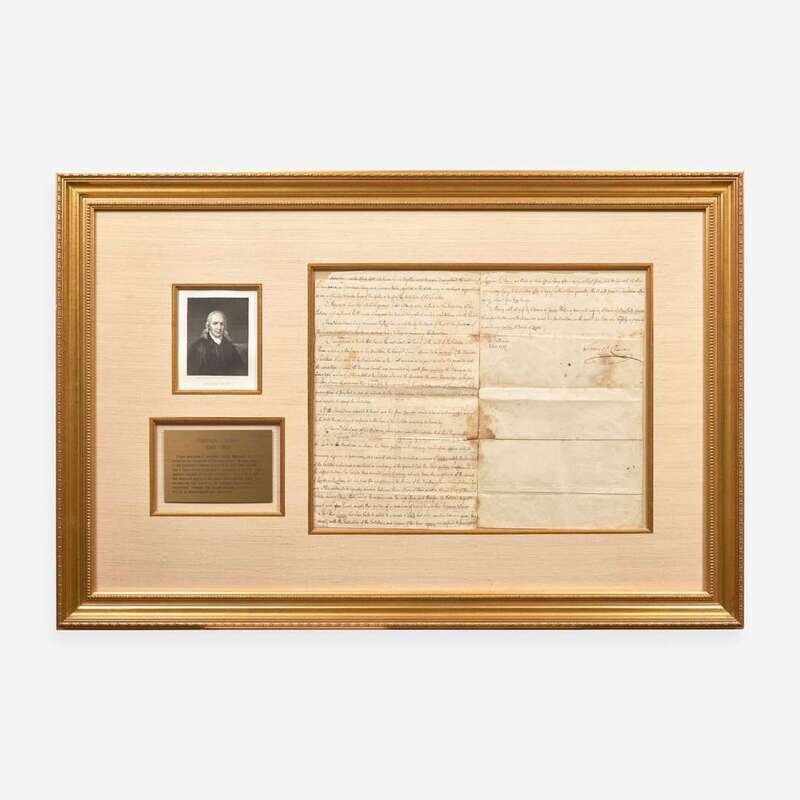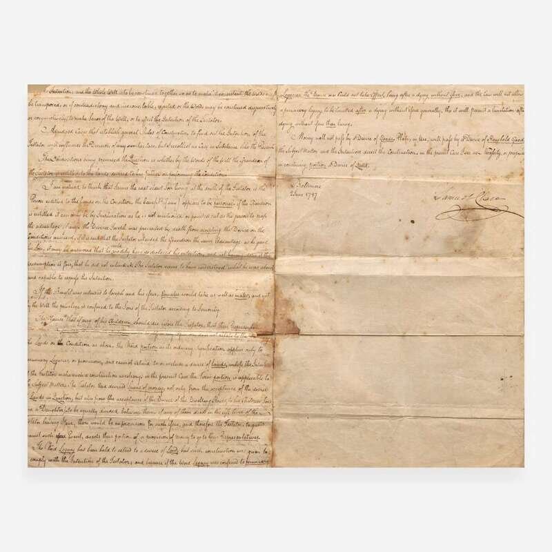 Baltimore, June 2, 1787. One sheet folded to make four pages, 14 x 18 in. (355 x 457 mm). Manuscript document, signed by Signer of the Declaration of Independence from Maryland, Samuel Chase (1741-1811), attesting to the settlement of the last will and testament of Joseph Nicholson. Creasing from old folds, a few small separations along same; scattered foxing; a few large stains partially affecting signature. In mat and in frame with a portrait of Chase, 25 1/2 x 37 3/4 in. (647 x 958 mm).