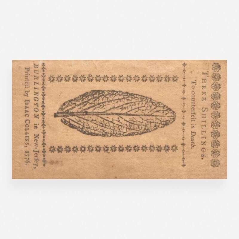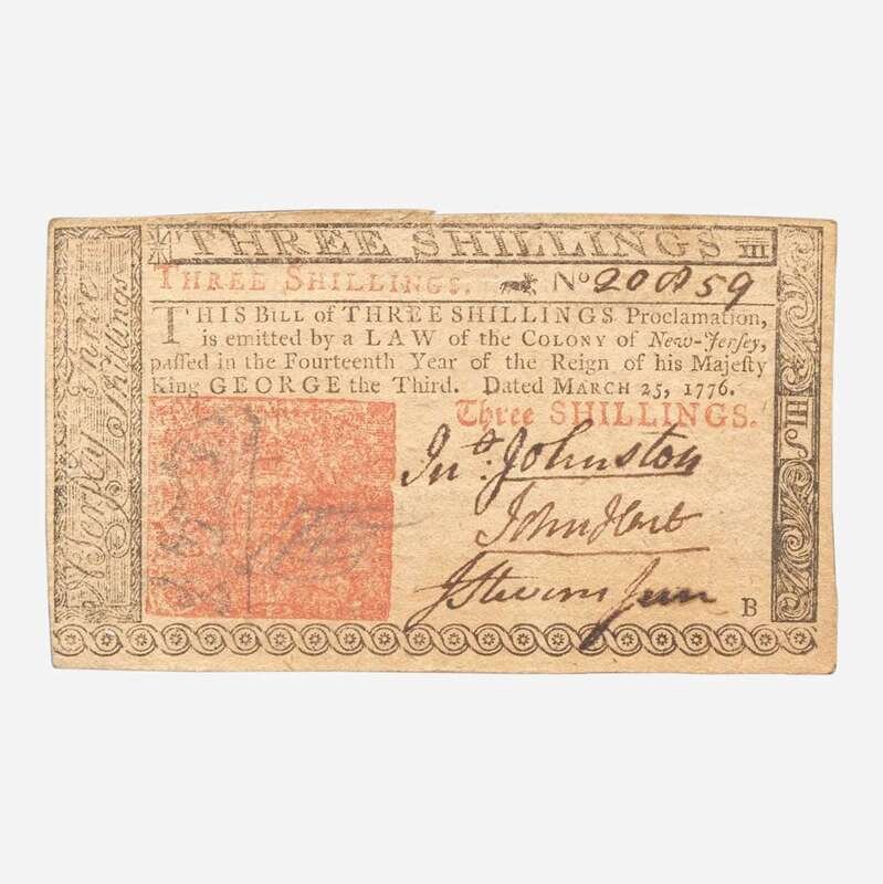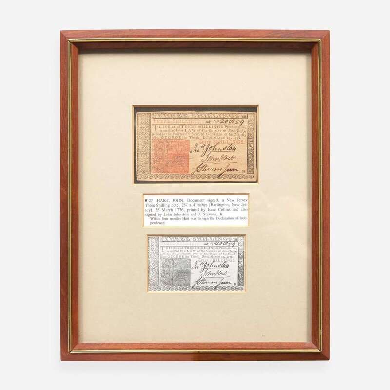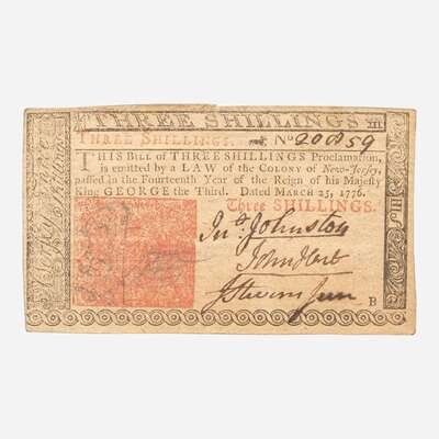 Isaac Collins: no place (Burlington), March 25, 1776. 2 1/4 x 4 in. (57 x 101 mm) (sight). Engraved New Jersey colonial currency note, signed by Signer of the Declaration of Independence from New Jersey, John Hart (1713-1797), for three shillings; counter-signed by John Johnston and John Stevens, Jr. In mat and in frame, 11 x 9 in. (279 x 228 mm).