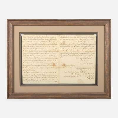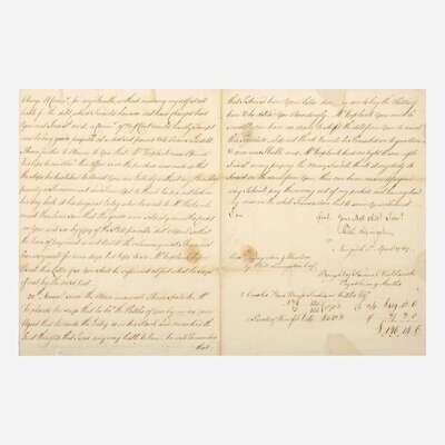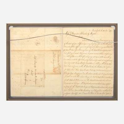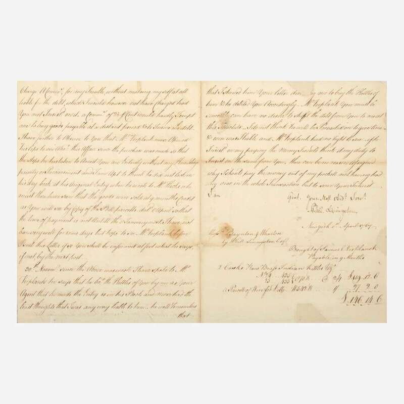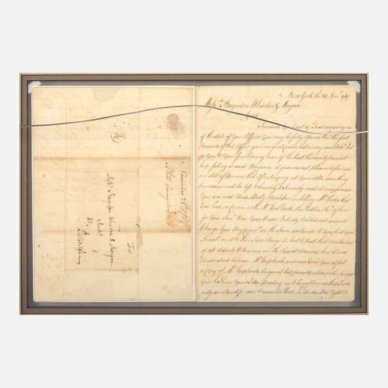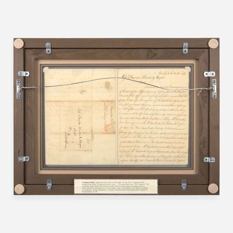 New York, April 8, 1767. One sheet folded into four pages, 10 x 14 3/4 in. (254 x 375 mm). Manuscript letter, signed by Signer of the Declaration of Independence from New York, Philip Livingston (1716-1778), to "Messrs: Baynton Wharton & Morgan" reviewing a business account with them, and addressing a dispute: "it gives me real pleasure to find you are still of Opinion that after paying all your debts, something handsome will be left...You are most Undoubtedly Mistaken in telling Mr. Hicks that you had no concern with Mr. Verplanck...I have further to Observe to you that Mr. Verplanck never Opened his lips to me Abo't this Affair since the purchase was made so that the steps he has taken to Arrest You are Entirely without my Knowledge privity or Procurement...there can be no reason Assigned why I should pay the money out of my pockett not having had any view in the whole Transaction..." Creasing from old folds; scattered stains; a few small tears in top margin repaired with tape on verso; three small sections of loss replaced with paper, one affecting one word. In mat and in frame, unexamined out of frame, 16 1/4 x 21 1/4 (413 x 540 mm).