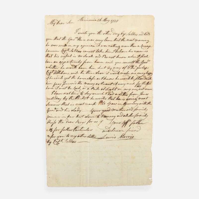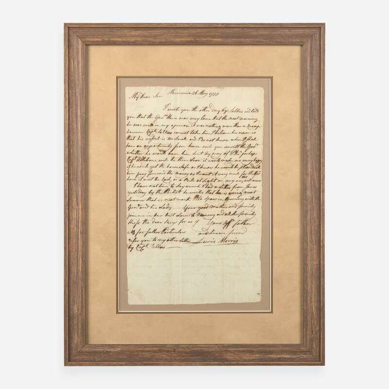 Morrisania, May 26, 1788. One sheet, 13 x 8 in. (330 x 203 mm). Autograph letter, signed by Signer of the Declaration of Independence from New York, Lewis Morris, to one of his six sons (likely Lewis V. Morris or Richard Valentine Morris), discussing the transport of a horse: "I wrote you the other day by Saltus and told you that the Govr. Morse was very lame but the next morning he was well in my opinion it was nothing more than a cramp however Capt Saltus cannot take him I believe his reason is that his vessel is too small...Will you consult the Govr whether he would have him sent by way of Phi(l)a(delphia)...it would make me very happy if he could get the horse safe..." Creasing from old folds; light toning; a few small ink stains; light offsetting from when folded. In mat and in frame, 20 1/2 x 15 1/2 in. (521 x 394 mm).