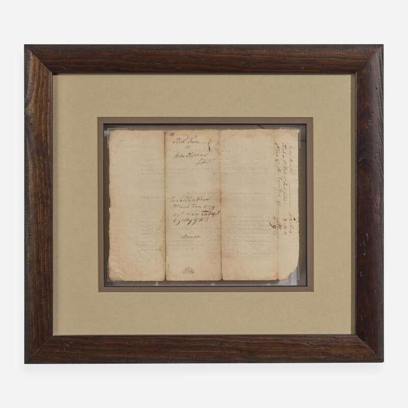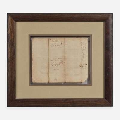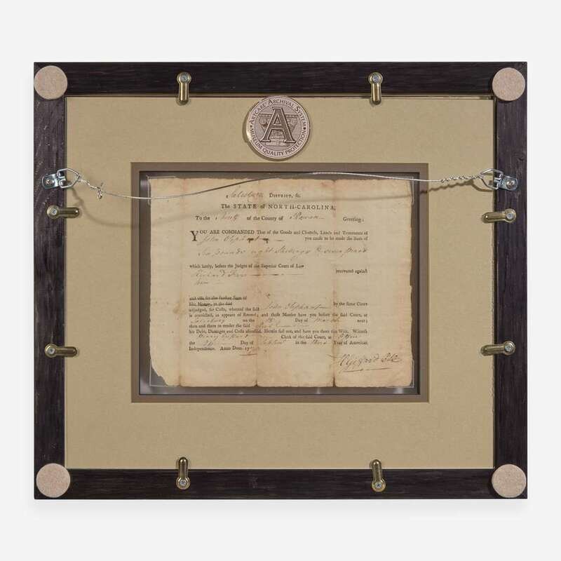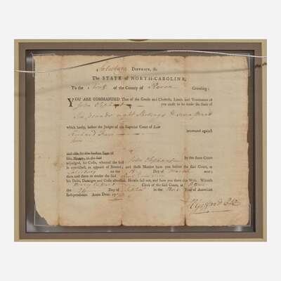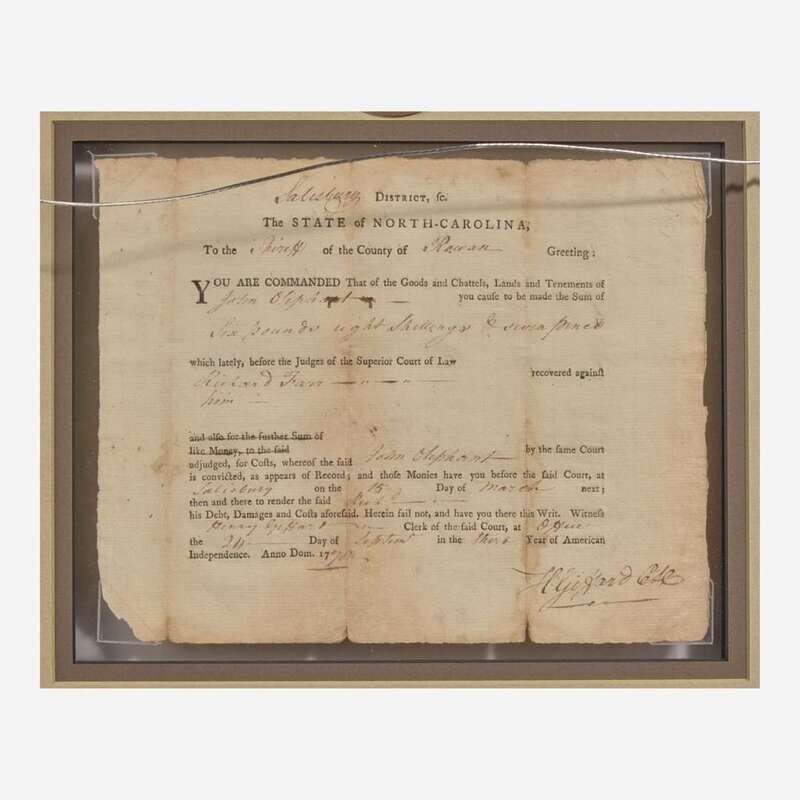 Salisbury, September 24, 1778. Single sheet, 6 1/2 x 8 in. (165 x 203 mm). Partially-printed document, initialed by Signer of the Declaration of Independence from North Carolina, William Hooper ("WHo"), endorsing a warrant for John Oliphant to pay a debt owed to Richard Farr; counter-signed by Henry Giffard as witness. Creasing from old folds, small separations and dampstaining along same; lightly toned. In mat and in frame, unexamined out of frame, 13 1/2 x 15 1/2 in. (342 x 393 mm).