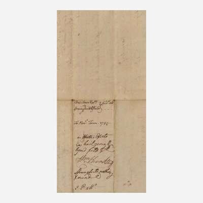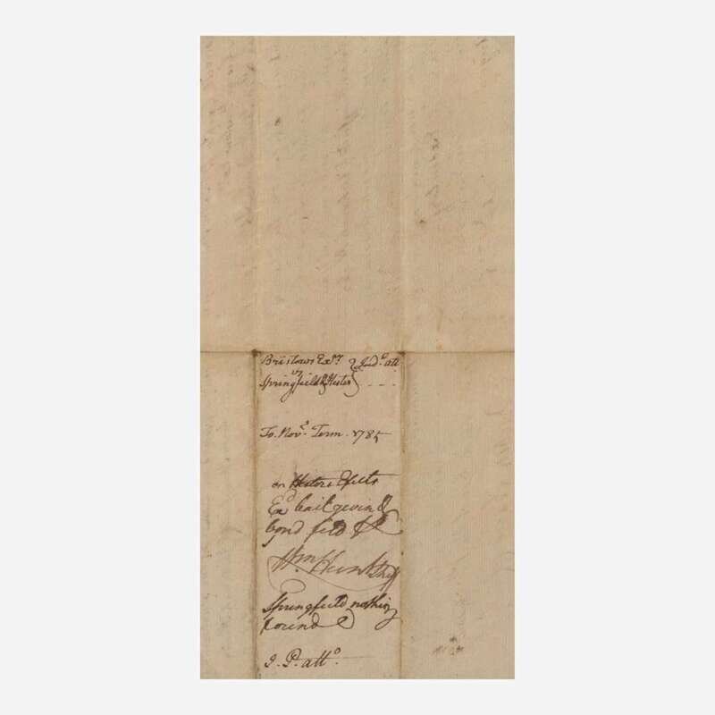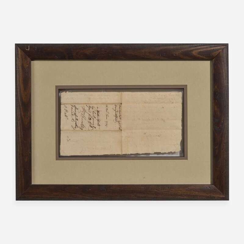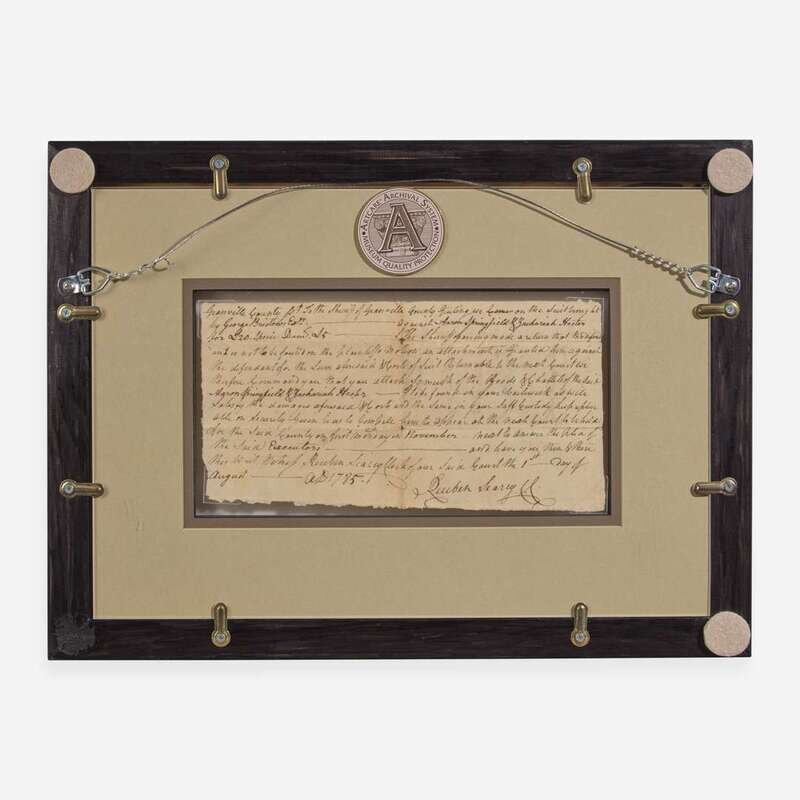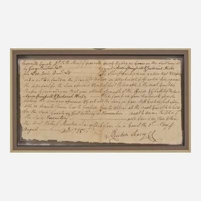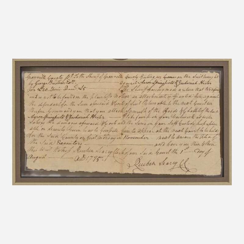 Granville County (North Carolina), August 1, 1785. Single sheet, 4 3/4 x 9 in. (121 x 228 mm). Manuscript document, initialed by Signer of the Declaration of Independence from North Carolina, John Penn ("J.P. Atto."), endorsing a warrant for Aaron Springfield and Zachariah Hester to appear in court against George Bristow; counter-signed by clerk Reuben Searcy. Creasing from old folds, a few small tears along same. In mat and in frame, unexamined out of frame, 11 3/4 x 16 in. (298 x 406 mm).
