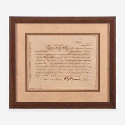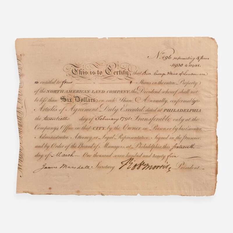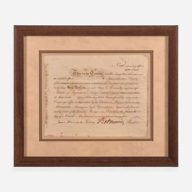 No place, March 16, 1795. One sheet, 9 3/4 x 12 in. (248 x 302 mm). Partially-printed document, signed by Signer of the Declaration of Independence from Pennsylvania, Robert Morris, as President of the North American Land Company, granting four shares of the company to Bird, Savage & Bird of London; counter-signed by James Marshall, Morris's son-in-law (brother of future Chief Justice of the Supreme Court, John Marshall). Foxed. In mat and in frame, unexamined out of frame, 17 x 20 in. (432 x 508 mm).