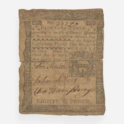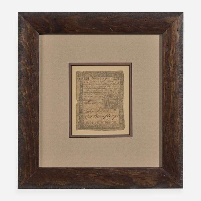 No place (Pennsylvania), April 3, 1772. 3 1/2 x 2 3/4 in. (88 x 70 mm) (sight). Engraved Pennsylvania colonial currency note, signed by Signer of the Declaration of Independence from Pennsylvania, John Morton, for "Eighteen Pence"; counter-signed by John Sellers and Charles Humphreys. Creasing from old folds; worn. In mat and in frame, unexamined out of frame, 10 1/4 x 9 1/2 in. (260 x 241 mm).