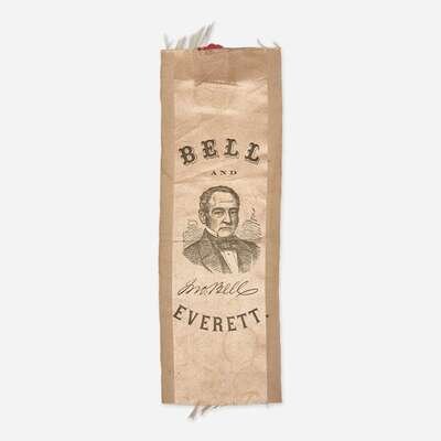 1860. Silk presidential campaign ribbon, with portrait of Tennessee politician John Bell of the Constitutional Union Party at center, above his printed facsimile signature, and with printed text, "Bell and Everett." Lightly frayed at top and bottom; old creasing; some faint dampstaining in right side; remnants of old mount on verso.