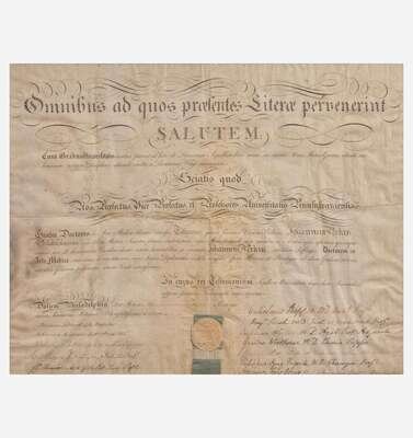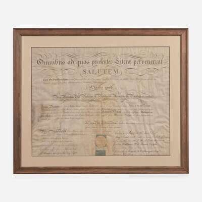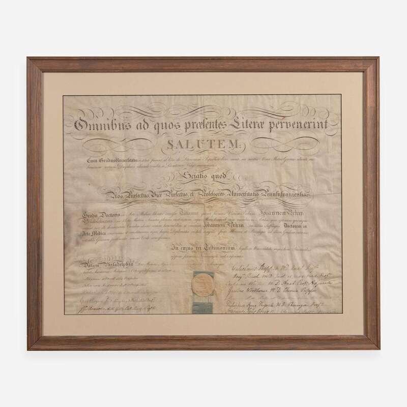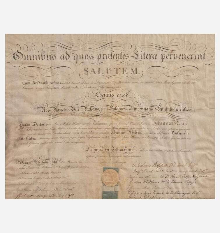Philadelphia, April 28, 1808. Single vellum sheet, 18 1/2 x 23 /12 in. (470 x 596 mm). Partially-printed document in Latin, signed by Signer of the Declaration of Independence from Pennsylvania, Benjamin Rush (1746-1813), being a diploma from the University of Pennsylvania, naming John Perkin a Doctor of Medical Science; counter-signed by 12 professors, including notable physicians William Shippen, Jr. (1736-1808) ("Guilemus Shippen"); Caspar Wistar (1761-1818) ("Casparus Wistar"); Robert Patterson (1743-1824) ("Robertus Patterson"); paper seal intact at bottom. In mat and in frame, 25 x 30 in. (635 x 762 mm).