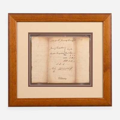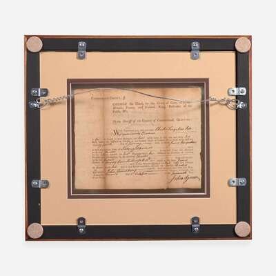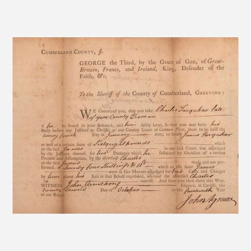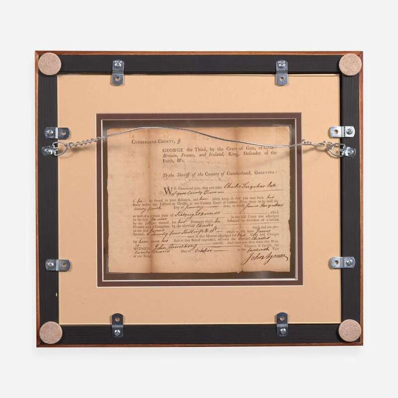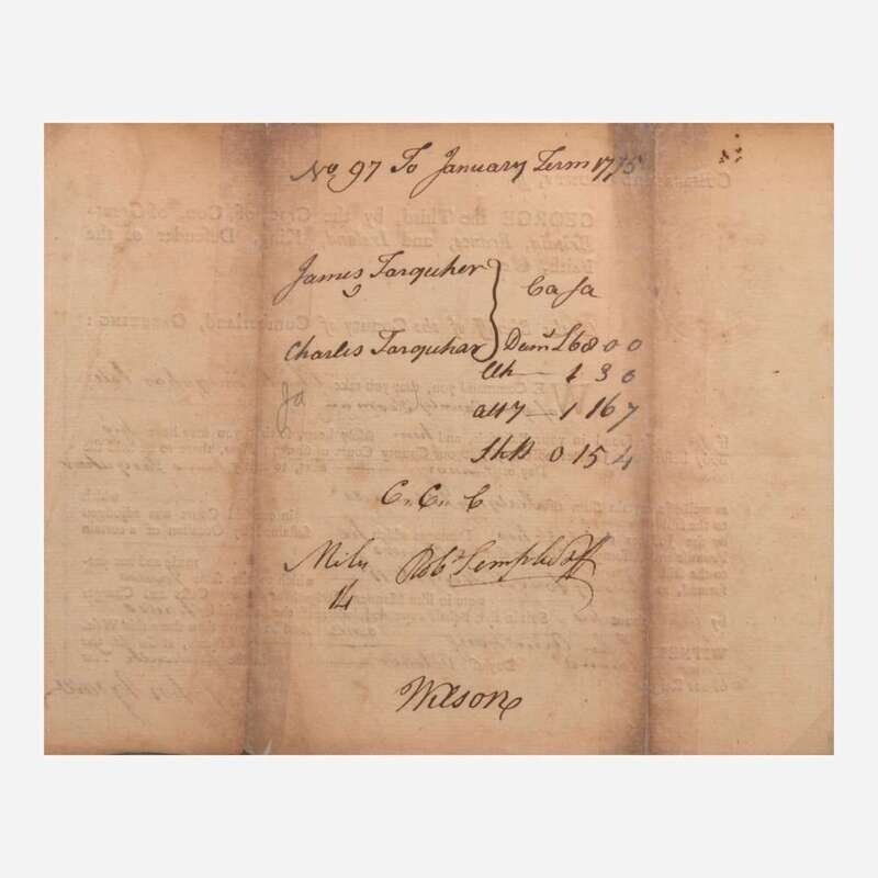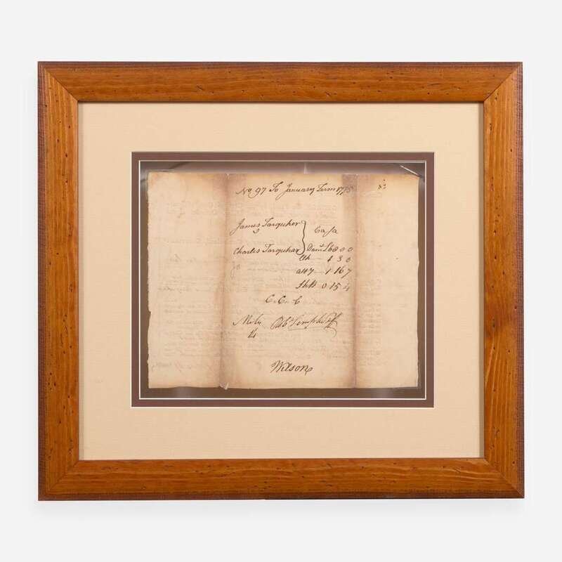 Cumberland County (Pennsylvania), October 22, 1774. Single sheet, 6 1/2 x 8 in. (165 x 203 mm) (sight). Partially-printed document, signed by Signer of the Declaration of Independence from Pennsylvania, James Wilson ("Wilson") (1742-1798), as an attorney, certifying a debt settlement between Charles and James Farquhar; counter-signed by John Agnew; docketed on verso. Creasing from old folds, tears along same repaired on verso with tape; unevenly toned. In mat and in frame, 13 1/4 x 15 in. (336 x 381 mm).