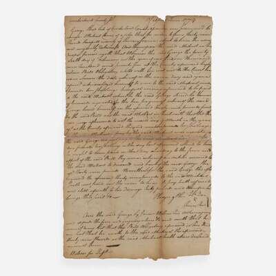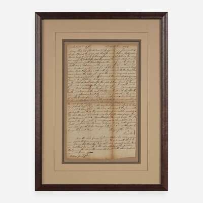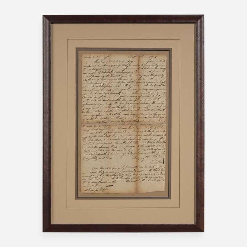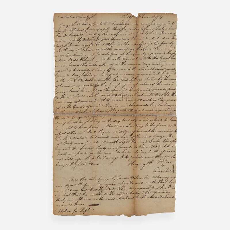 Cumberland County (Pennsylvania), April, 1774. Single sheet, 7 1/2 x 12 in. (191 x 305 mm). Manuscript document, signed twice, on recto and verso, by Signer of the Declaration of Independence from Pennsylvania, James Wilson ("Wilson for Deft.") (1742-1798), as an attorney, appearing for his client, George Shad, who was summoned to answer for a debt. Creasing from old folds, separations along same repaired with tape, recto and verso; edges chipped, affecting some letters. In mat and in frame, unexamined out of frame, 19 1/2 x 14 1/2 in. (495 x 368 mm).