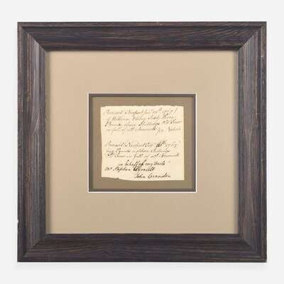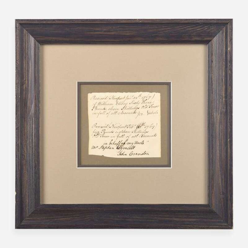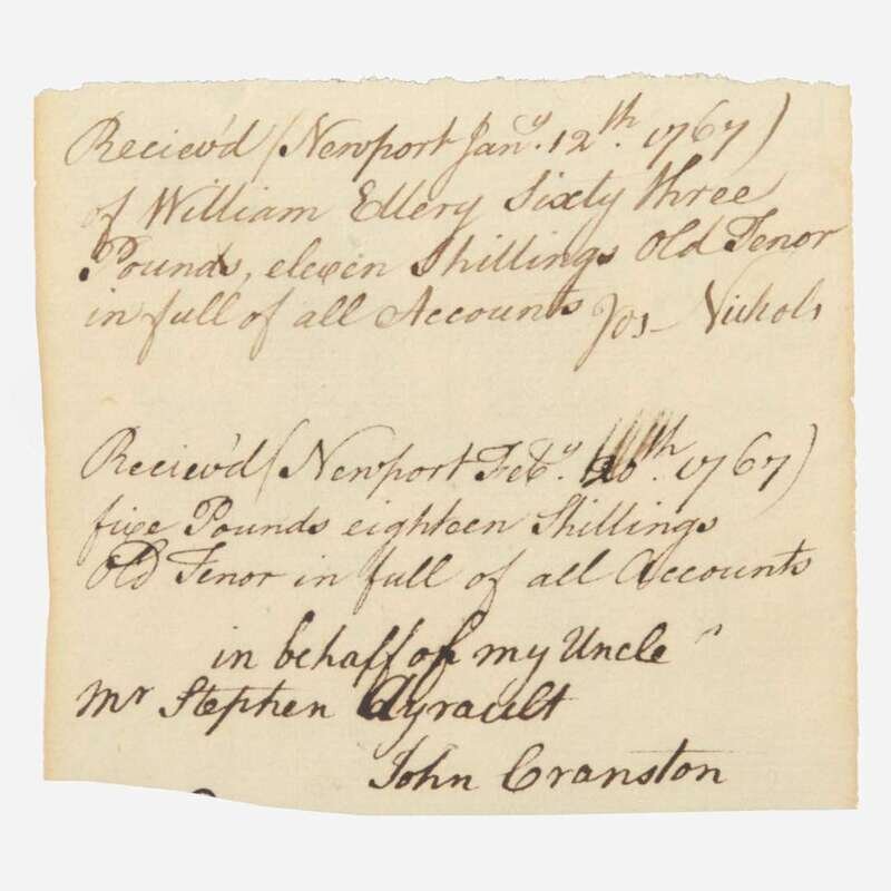 Newport (Rhode Island), January 12, 1767. Single sheet, 3 1/4 x 3 3/4 in. (83 x 95 mm) (sight). Autograph document, completely in the hand of Signer of the Declaration of Independence from Rhode Island, William Ellery (1727-1820), authorizing a receipt for two separate transactions: "Reciev'd...of William Ellery Sixty three Pounds, eleven Shillings Old Tenor..."; counter-signed by John Cranston on behalf of his uncle, Stephen Ayrault. Unexamined out of frame, 10 3/4 x 11 1/2 in. (273 x 292 mm).