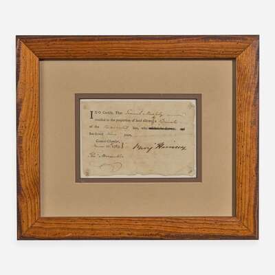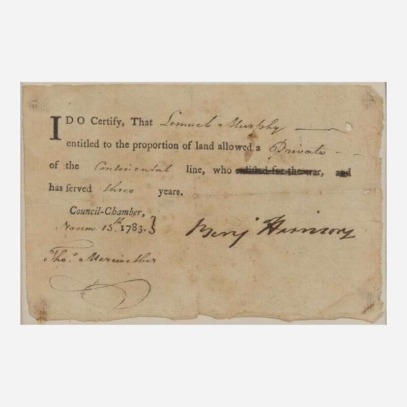 (Virginia), November 15, 1783. Single sheet, 4 x 5 3/4 in. (101 x 146 mm) (sight). Partially-printed document, signed by Signer of the Declaration of Independence from Virginia, Benjamin Harrison (1726-1791), as Governor of Virginia, certifying "That Lemuel Murphy entitled to the proportion of land allowed a Private of the Continental line, who has served three years"; counter-signed by Thomas Meriwether. Light foxing at center; residue from old mount in verso of corners. In mat and in frame, unexamined out of frame, 10 3/4 x 13 in. (272 x 330 mm).