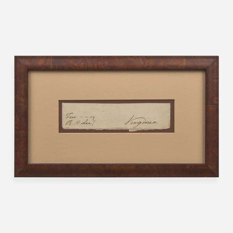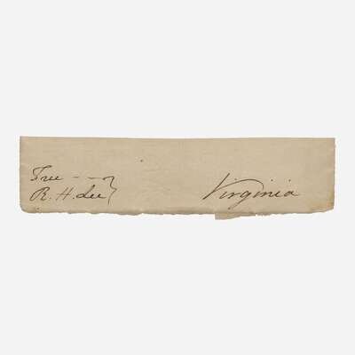 Virginia, no date. 1 1/2 in x 6 1/4 in. (38 x 159 mm) (sight). Signature of Signer of the Declaration of Independence from Virginia, Richard Henry Lee (1732-1794), cut from a larger sheet. In mat and in frame, unexamined out of frame, 7 1/4 x 12 3/4 in. (184 x 323 mm).