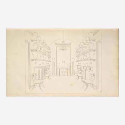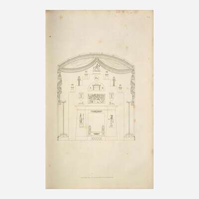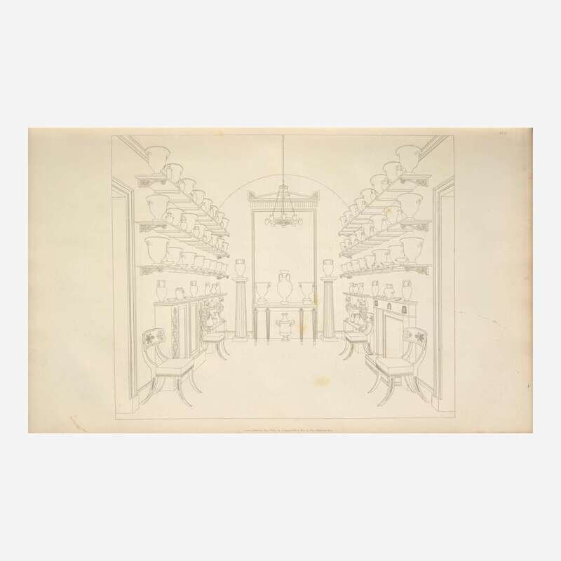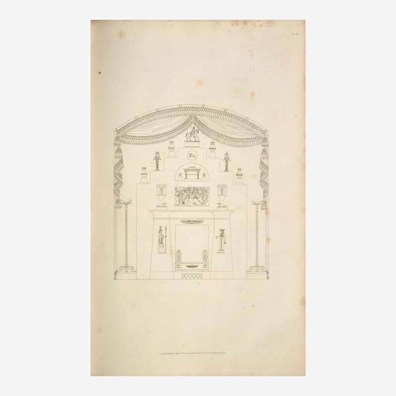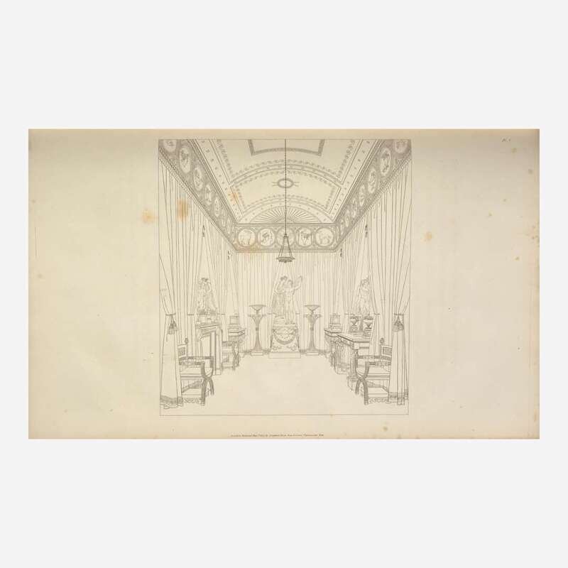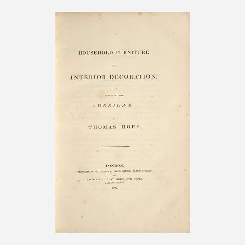 First edition of Thomas Hope's important Regency-era design book, the first to introduce the phrase "interior decoration" into the English language. Hope based his large, simple line drawings on the rooms from his own Dutchess Street mansion in London, a popular destination for London's fashionable elite. Hope published this work to promote his vanguard taste to the public, one that combined myriad styles and objects from different time periods, including Ancient Greek, Roman, Egyptian, Neoclassical French, as well as Ottoman and Indian sources.