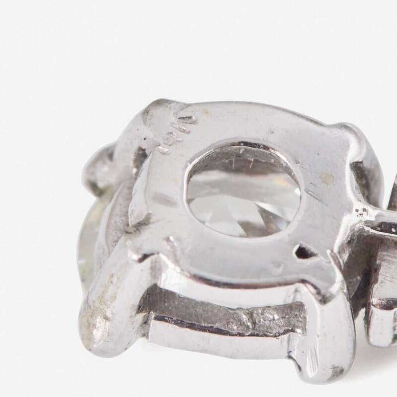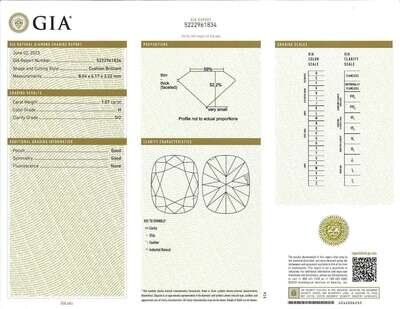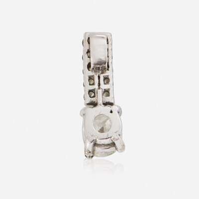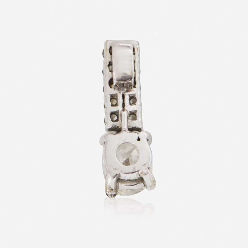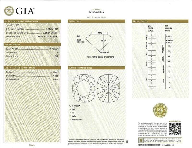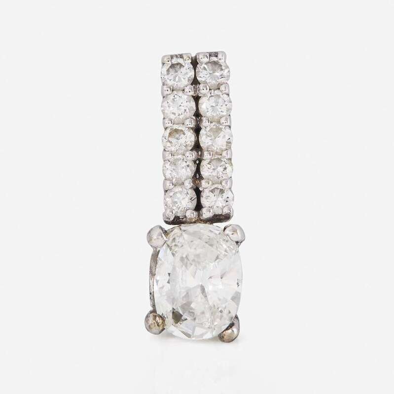 A 14K white gold drop pendant, featuring an oval cushion brilliant-cut diamond weighing approximately 1.07 carats, with (H) color, and SI2 clarity, and accented by ten round brilliant-cut diamonds, near colorless (G - J), with SI - I clarity. Total estimated weight of diamonds: 1.52 carats. Accompanied by GIA Report Number: 5222961834.