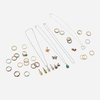 A collection of miscellaneous jewelry, including twenty-one 18K white and yellow gold rings by Hidalgo, two pairs of 18K yellow gold earrings by Hidalgo, one 18K yellow gold single earring by Hidalgo, and eight 18K white and yellow gold pendants by Hidalgo, all variously set with enamel and diamonds, as well as an engraved 18K white gold band, an 18K white gold band set with diamonds, an 18K white gold chain, a two-tone 18K white and rose gold German chain, a 14K white gold chain, a sterling silver chain, and an 18K yellow gold pendant designed as a butterfly and set with enamel.