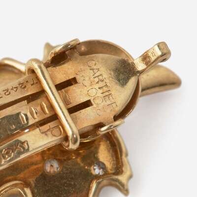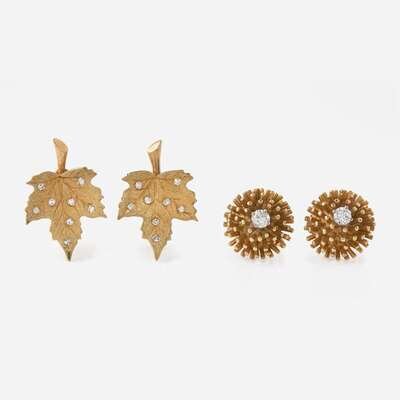 Two pairs of yellow gold ear clips by Cartier, one pair crafted from 18K yellow gold designed as leaves set with single-cut diamonds, the other crafted from 14K yellow gold designed as spiked half-domes each centering a round brilliant-cut diamond. Both pairs are suitable for non-pierced ears. Diamonds are near colorless (G - J), with VS - SI clarity. Total estimated weight of diamonds: 0.62 carats.