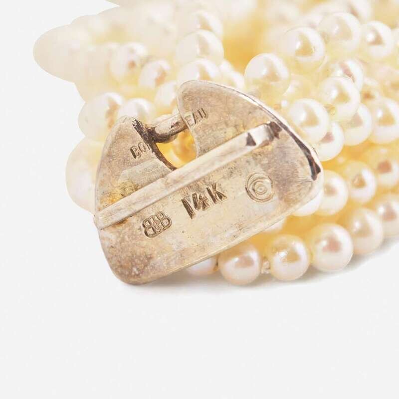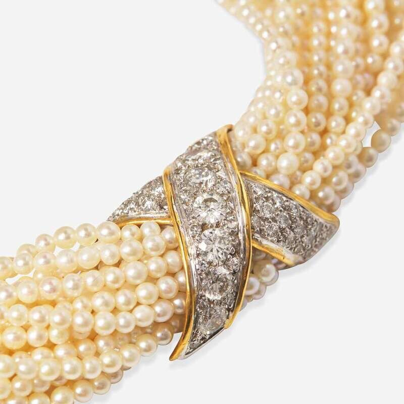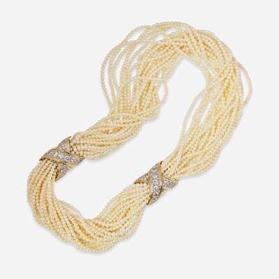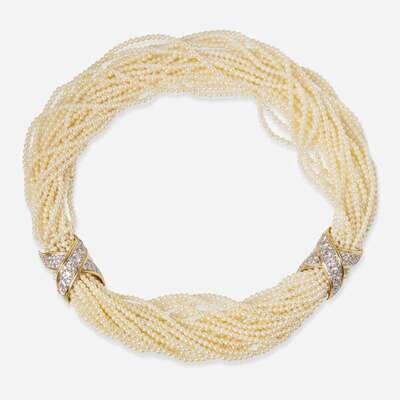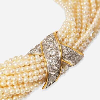 A Boris LeBeau pearl torsade, featuring twenty strands of seed pearls each measuring approximately 2.50mm, with two accent sections fashioned from two-tone 14K white and yellow gold, and set with round brilliant-cut diamonds. One of the accent sections acts as a hidden clasp. Diamonds are near colorless (G - J), with VS - SI clarity. Total estimated weight of diamonds: 6.65 carats.