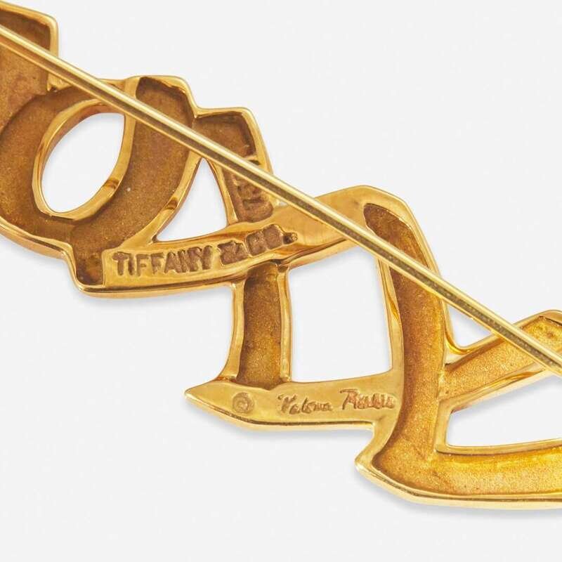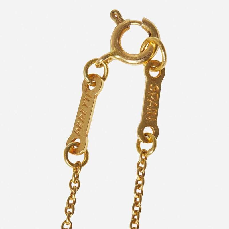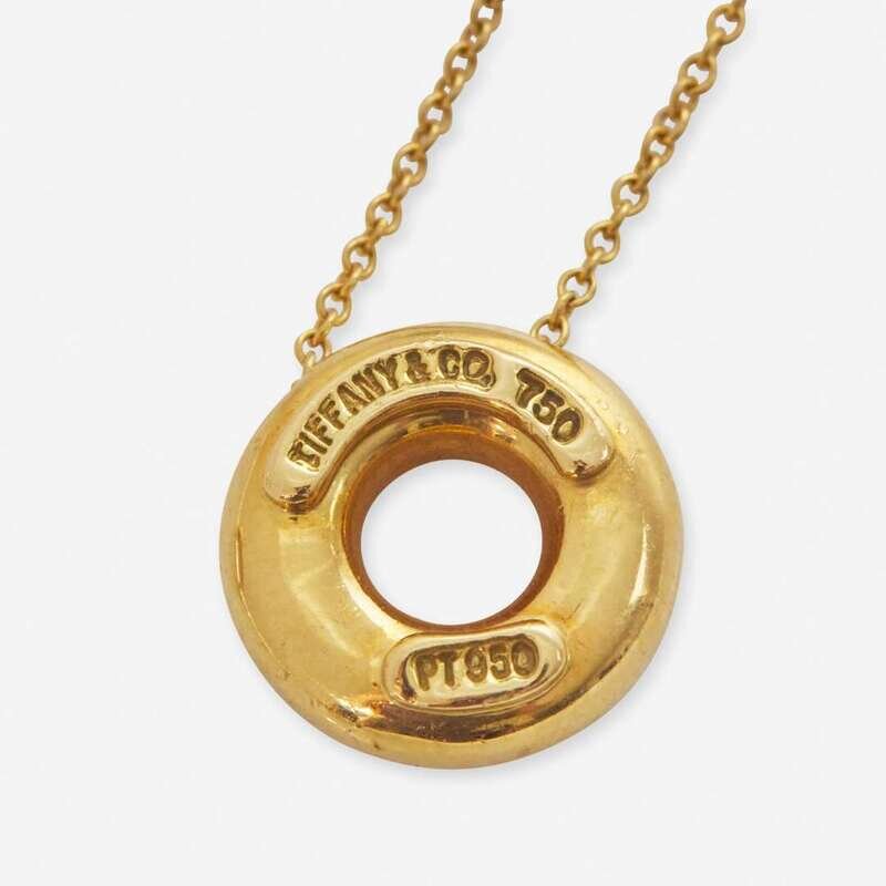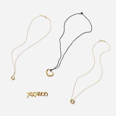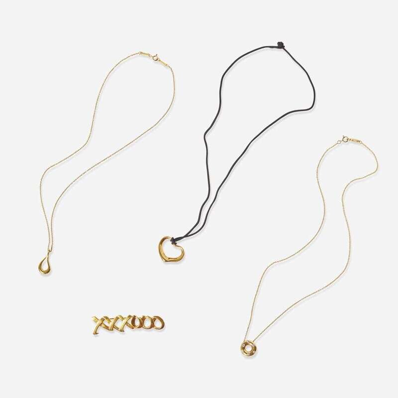 A collection of 18K yellow gold jewelry, including a heart pendant by Elsa Peretti on a black cord necklace, a yellow gold necklace with a donut-shaped pendant set with round brilliant-cut diamonds, a necklace with a drop pendant by Elsa Peretti, and a brooch reading "XXXOOO" by Paloma Picasso.