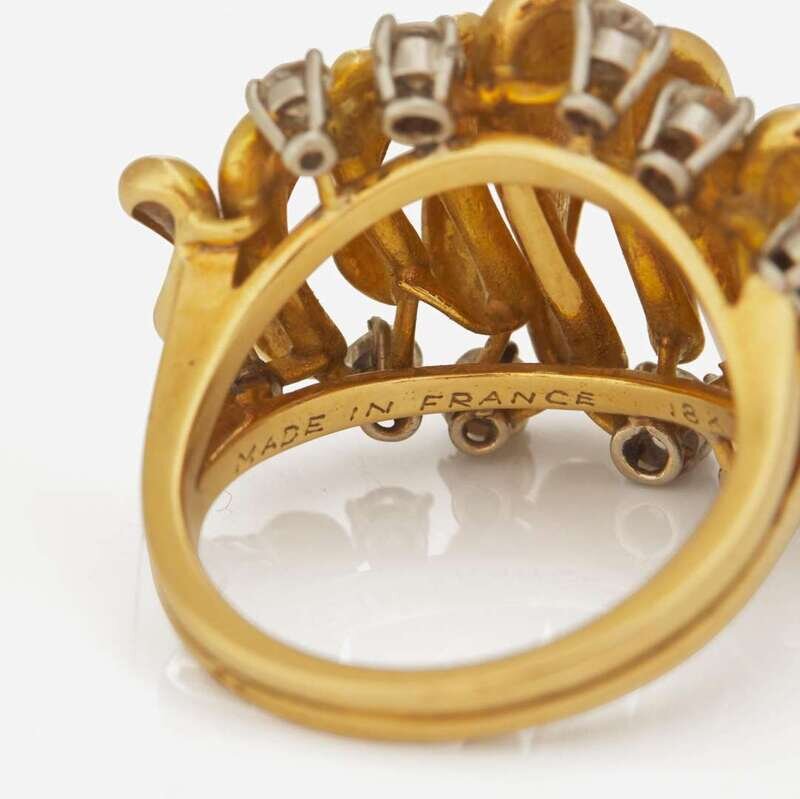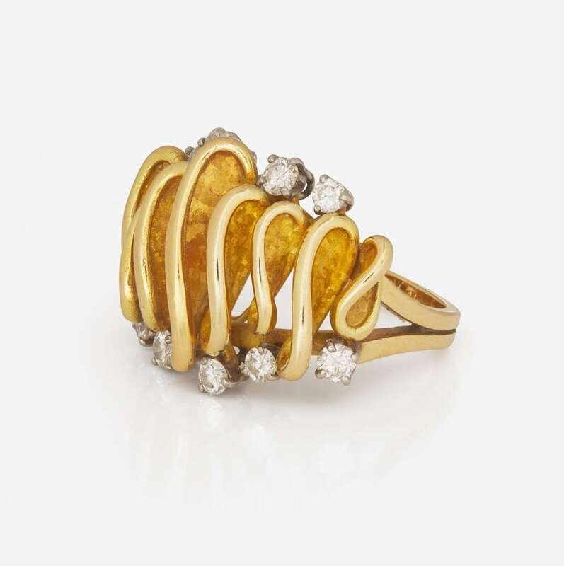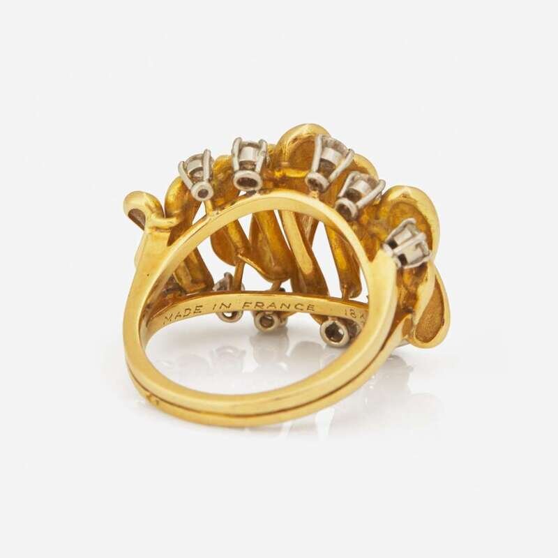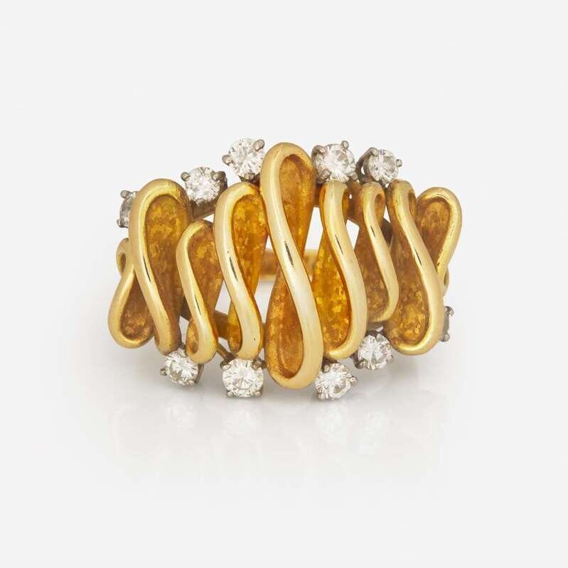 An 18K yellow gold French ring designed as waves of yellow gold punctuated by round brilliant-cut diamond accents. Diamonds are near colorless (G - J), with VS - SI clarity. Total estimated weight of diamonds: 0.70 carats.