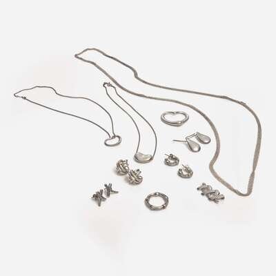 A miscellaneous collection of sterling silver Tiffany & Co. jewelry, including three necklaces designed by Elsa Peretti featuring heart-shaped pendants, a bamboo-style ring and matching half-hoop earrings, a brooch that reads "XXX" by Paloma Picasso and matching stud earrings, a pair of ridged cross earrings, and a pair of drop earrings designed by Elsa Peretti.
