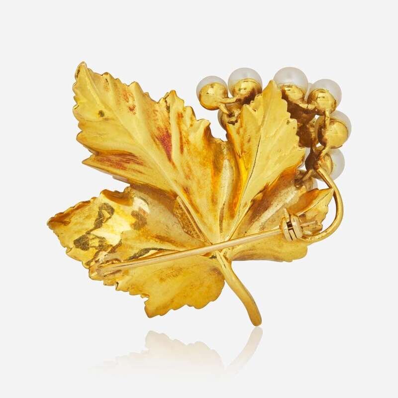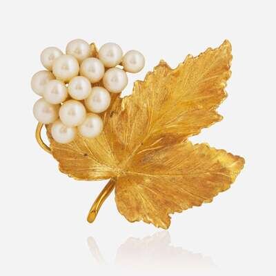 An 18K yellow gold brooch by Tiffany & Co. designed as a finely textured leaf, accented by a cluster of round cultured pearls measuring from approximately 4.87mm at the smallest to approximately 5.67mm at the largest.